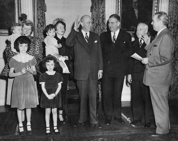 Peter Quinn is in his Aunt Marion's arms on the extreme left, while Tom is in his mother's arms, and sisters Sheila and Kathleen are in the front row as their father is sworn in as a judge by Mayor William O'Dwyer (1949).