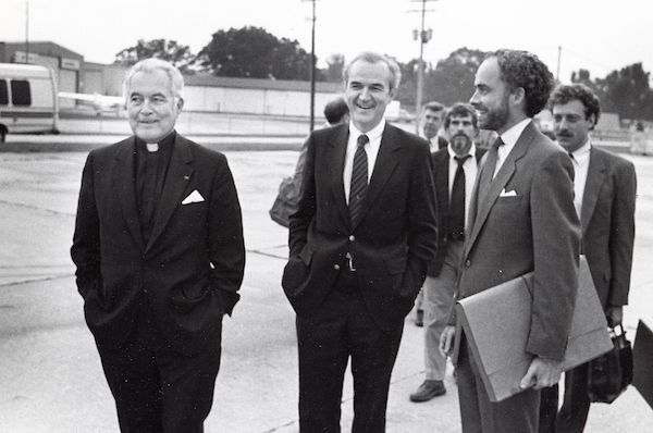 Peter Quinn pictured with the Rev. Theodore Hesburgh, president of the University of Notre Dame, left, and the Rev. Richard McBrien, head of the Department of Theology, center, before Gov. Mario Cuomo's speech there, "Religious Belief and Public Morality," in 1984.