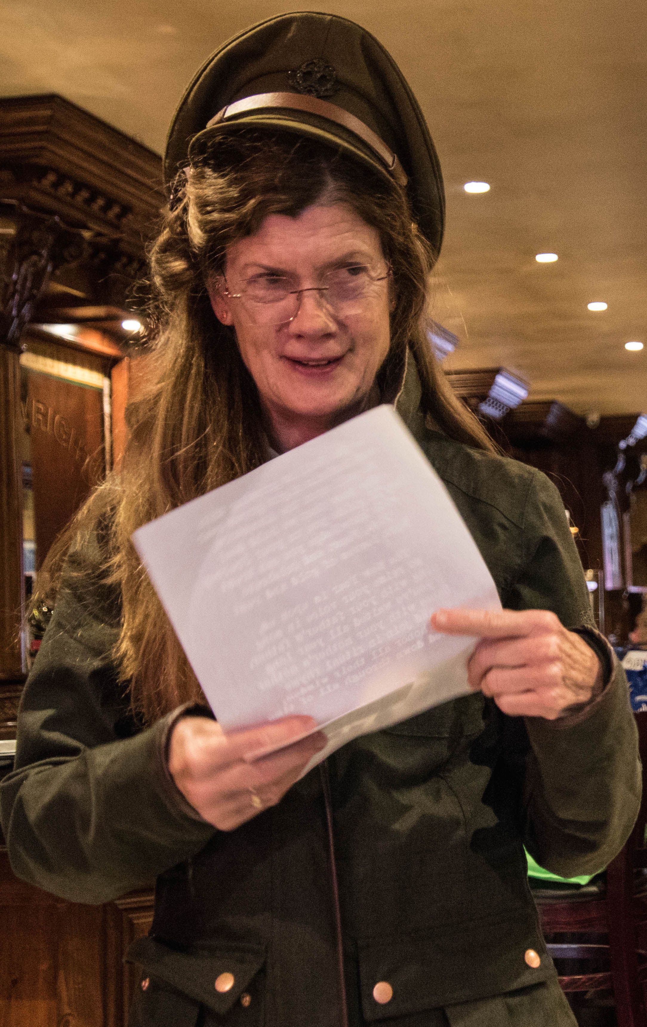 Pat Mangan brought on Hannah Sheehy Skeffington, a suffragette and staunch Irish nationalist who campaigned for women’s rights in Ireland. In a convincing presentation, Pat told us that Sheehy Skrffington also toured the U.S. in 1916 speaking about the abuses of the British military in the immediate aftermath of the Easter Rising (including the shooting dead of her pacifist husband, Francis, and two other journalists in a controversial incident at Portobello Barracks).