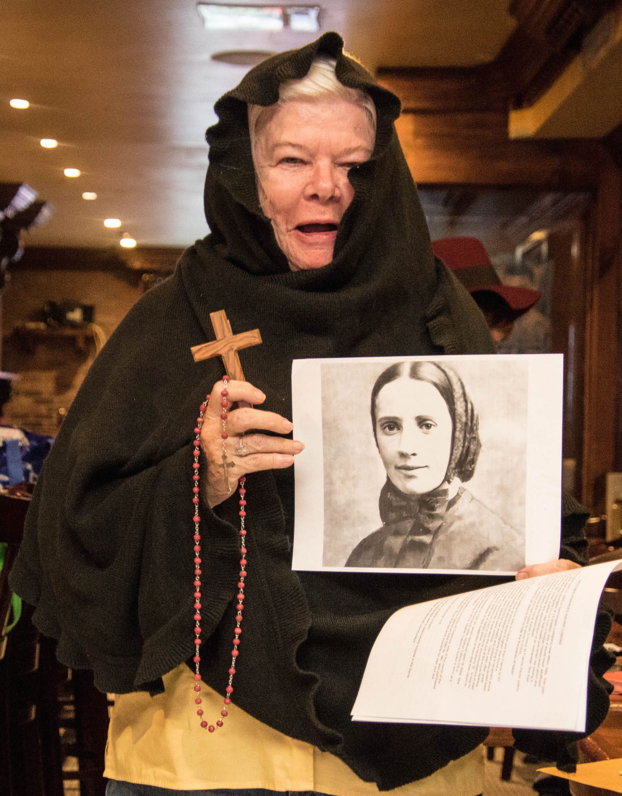 In celebration of her 75th Jubilee Anniversary of her canonization in 1946 and reminding us that All Saints Day was approaching, Mother Frances Xavier Cabrini appeared. Sheila Houlihan told us that Cabrini was the first U.S citizen to be declared a saint. She is honored as the Patroness of Immigrants and Refugees.