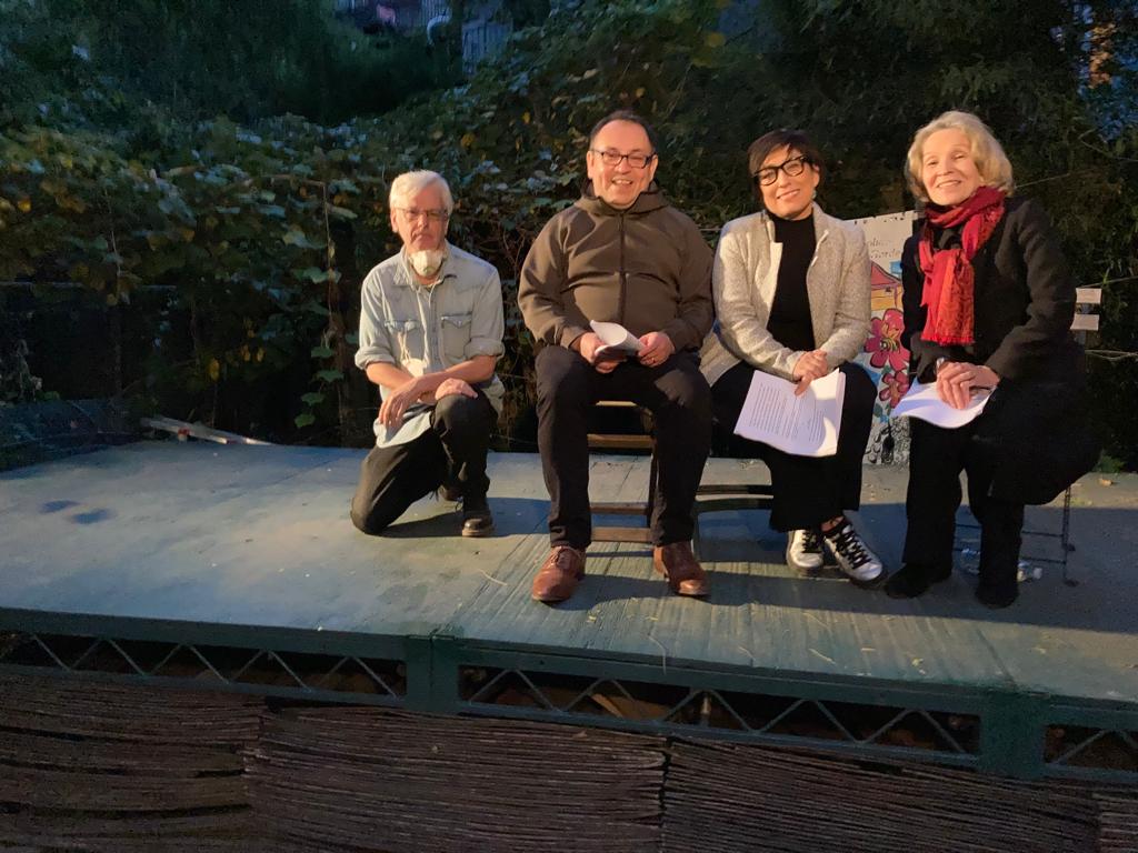 Scanlon’s latest creative outing also had a Spanish-language component. A bilingual reading was staged in the Green Oasis Garden on Manhattan’s Lower East Side with Irish actors Gina Costigan and Tim Ruddy directed by Don Creedon and Spanish-lnaguage actors Laura Spalding and Fabian Gonzalez directed by Monica Flores Correa. Costigan and Ruddy were also involved in the radio play version of “The Long Wet Grass” in September 2021 produced by the Cell Theater Company.