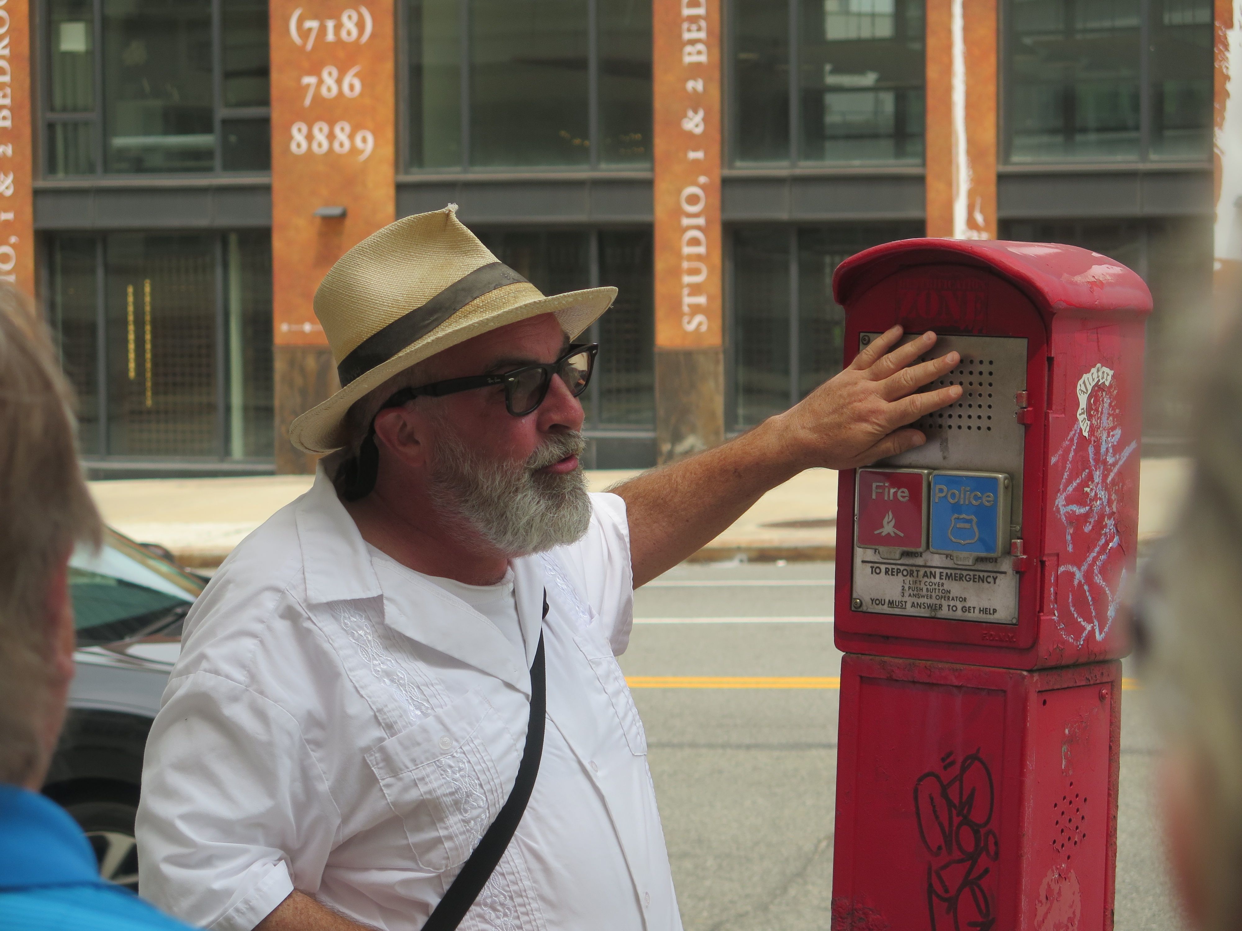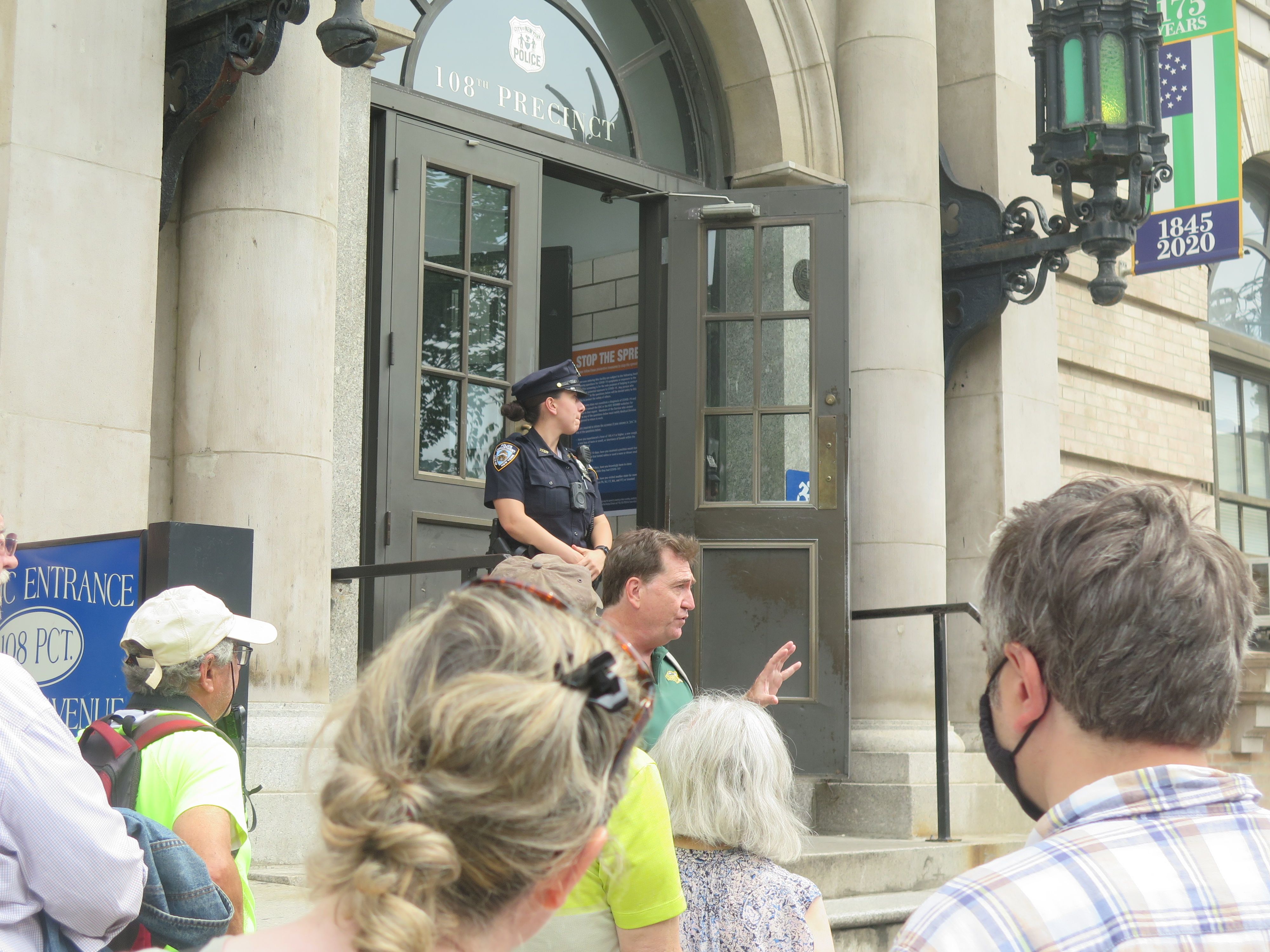 Plenty of minutiae were relayed, too – like in front of the 108th Precinct we heard about the origin of “copper” as a slang word for police officer. Upon hearing this, a young uniformed officer said, “Copper is the name of our precinct cat!”