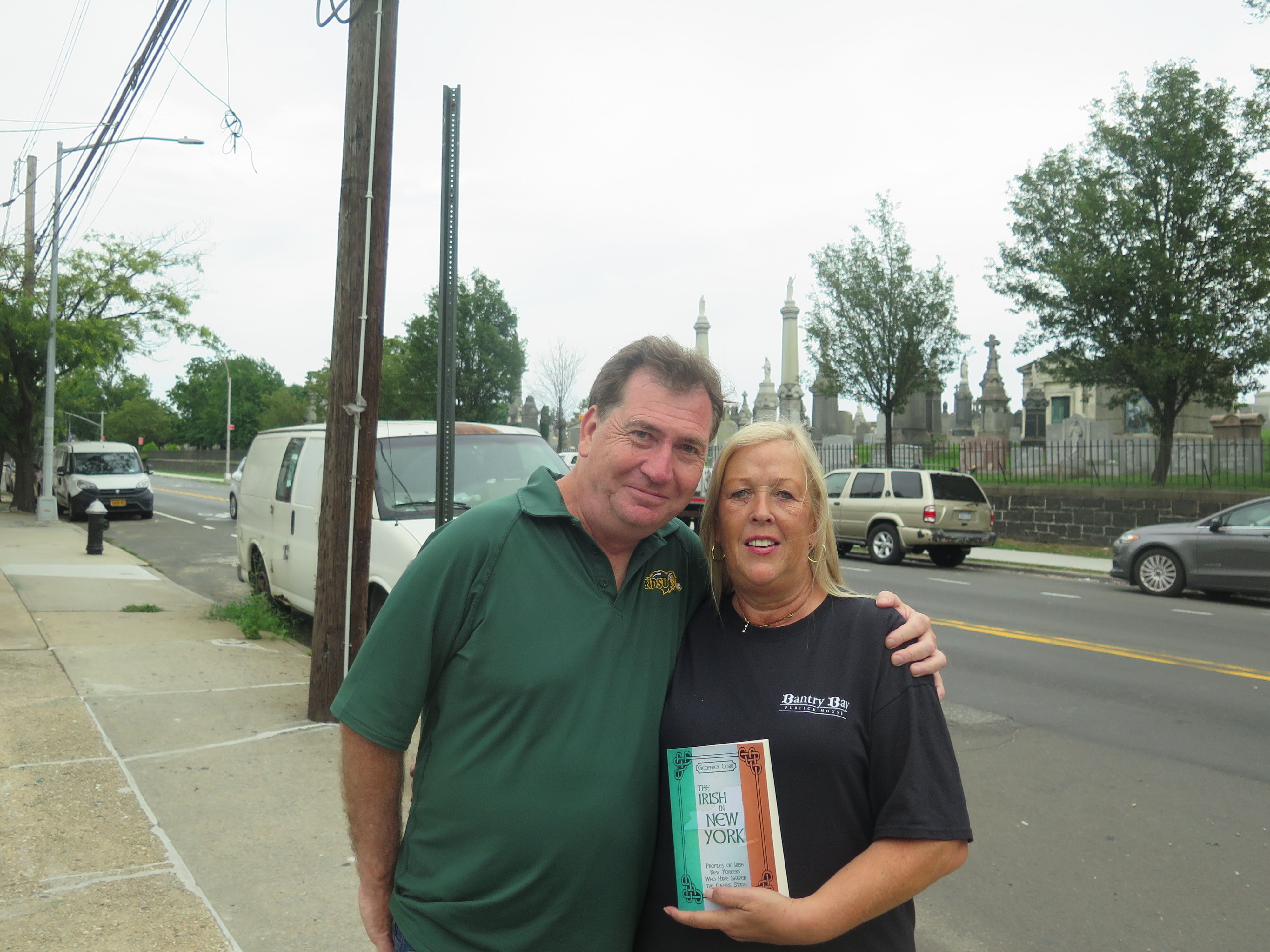 Geoffrey Cobb presented Bantry Bay’s Geraldine Clooney with a copy of his book “The Irish in New York.” Many of its personalities are buried in Calvary Cemetery across the street.
