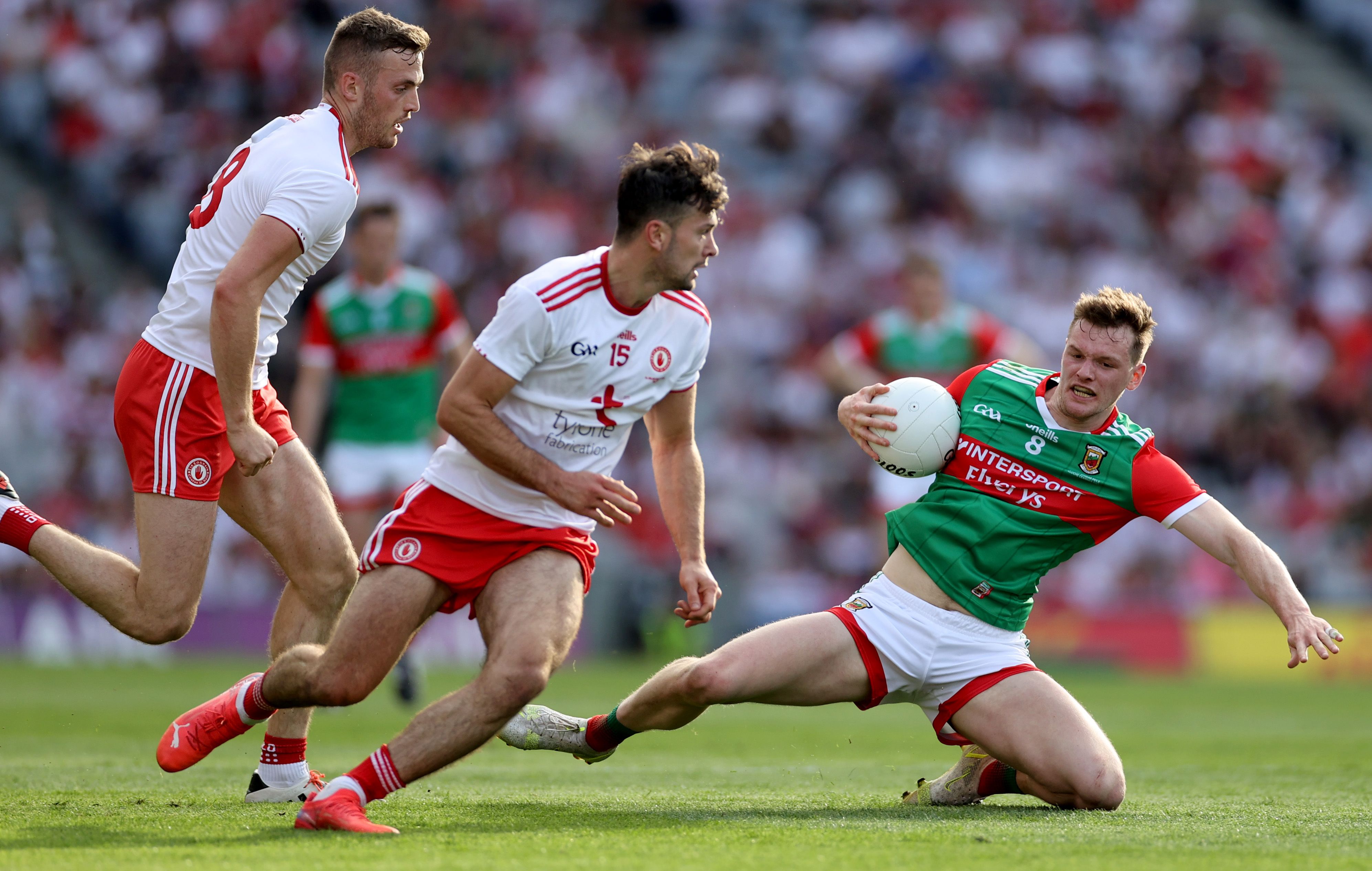 Tyrone's Brian Kennedy and Conor McKenna in Croke Park action with Matthew Ruane of Mayo
