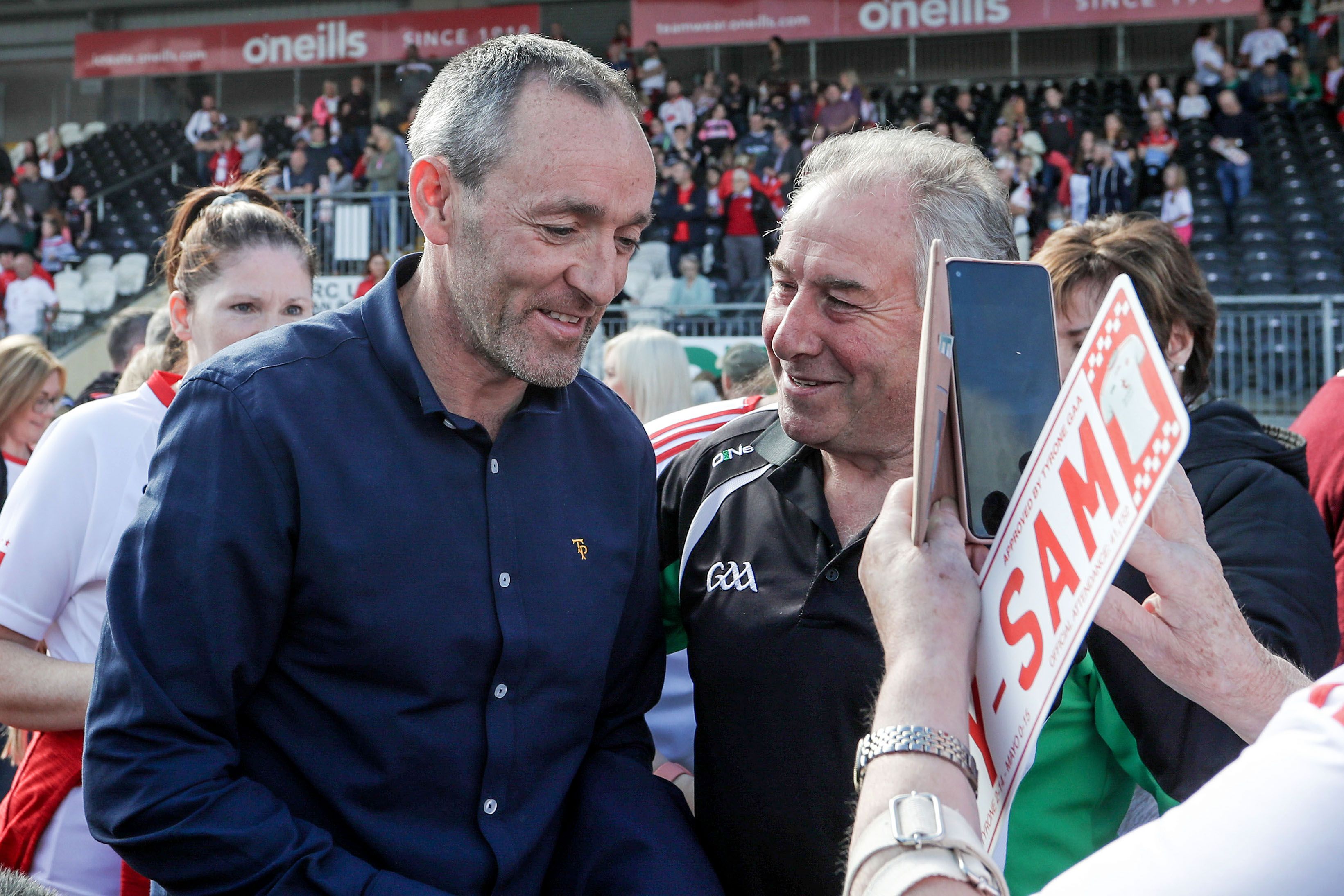 Tyrone joint manager Brian Dooher with fans at Sunday’s homecoming at Healy Park, Omagh.