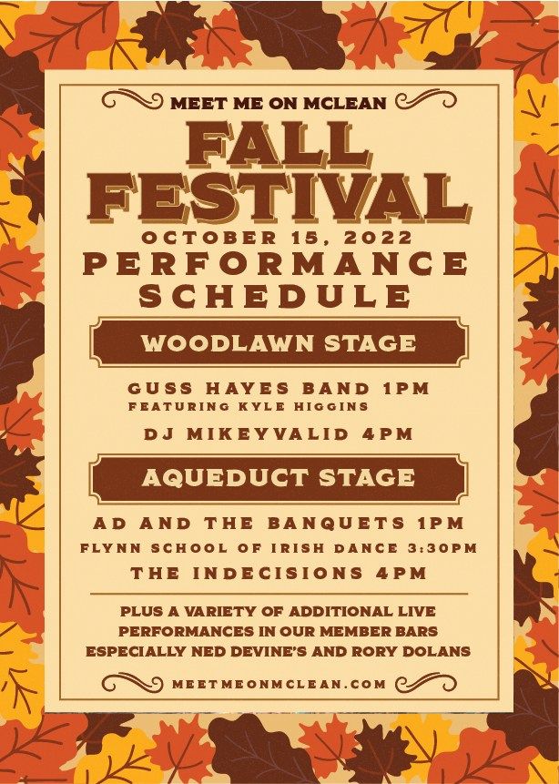 Here's a map/guide to show you where you can find everything (full quality version on website meetmeonmclean.com Don’t forget to wear your fall costume or outfit to the Fall Festival. There will be a contest for all ages to enter and winners will be selected for prizes for the best costume at around 5 PM at the Aqueduct Avenue stage.