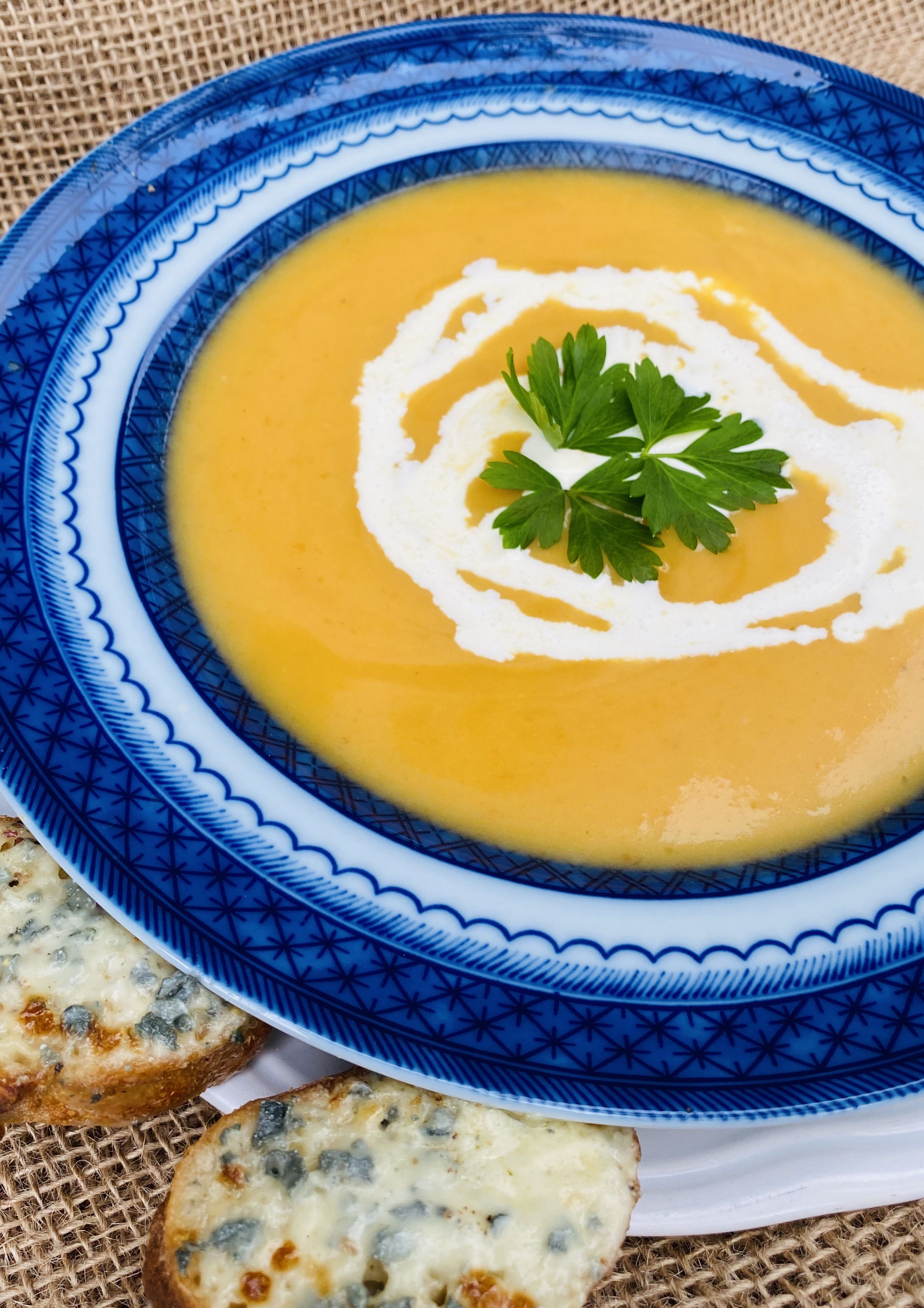 SQUASH SOUP WITH BLUE CHEESE CROÛTES