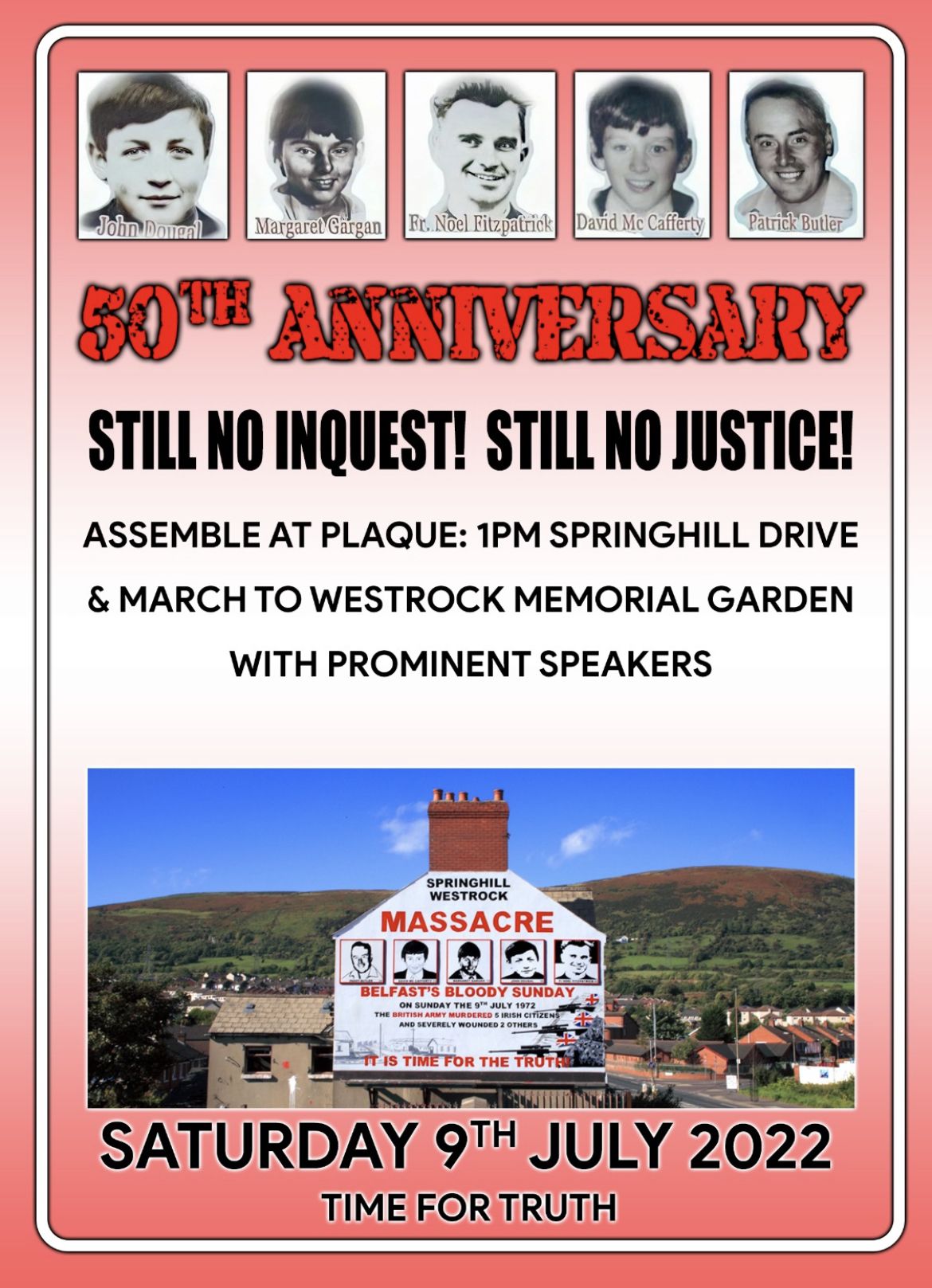 This Saturday will mark fifty years from the horrific events of the summer evening of 9 July 1972 when British soldiers shot and killed two adults and three children in the Springhill/Westrock area of Belfast.