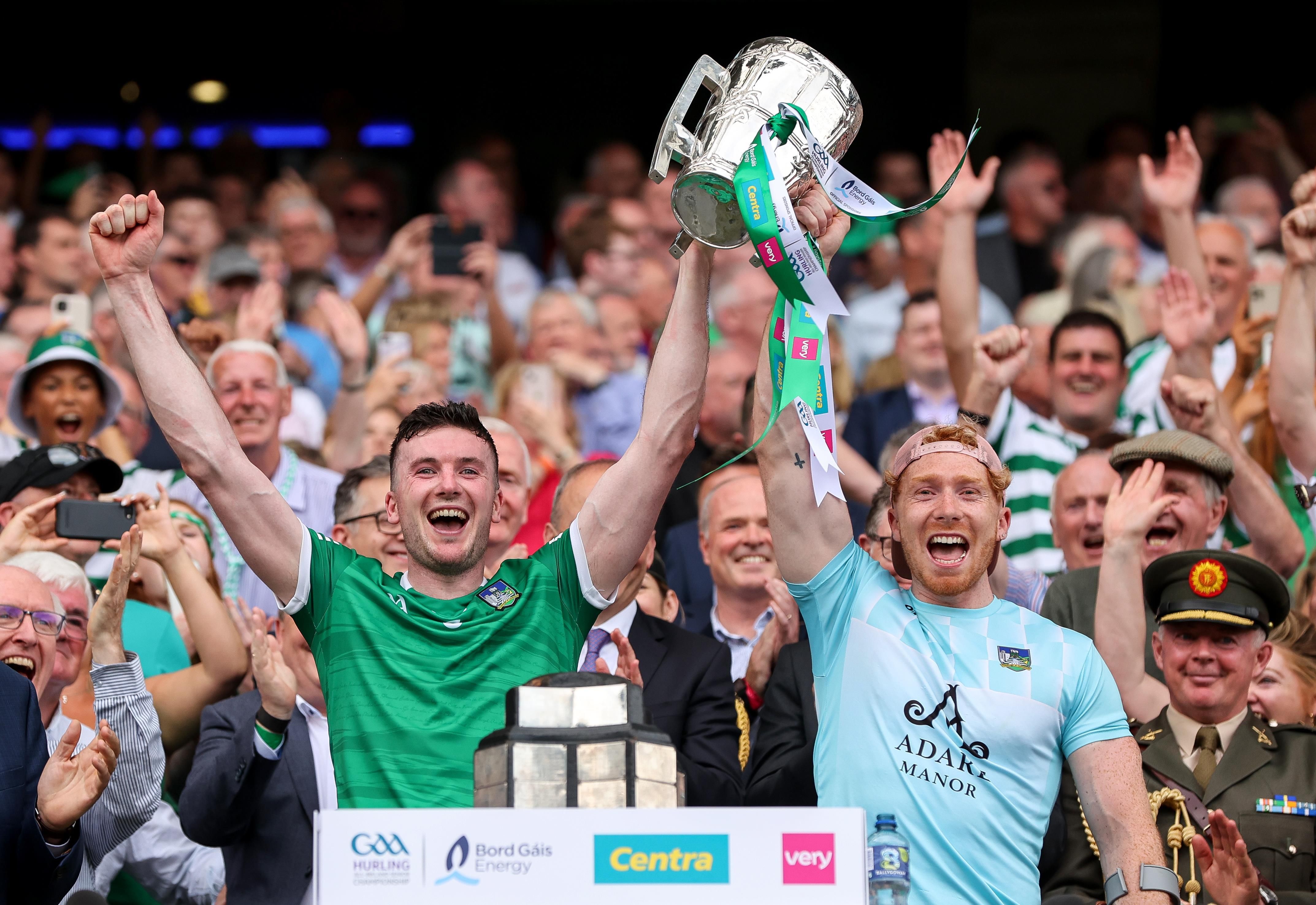 Declan Hannon, left, and the injured Cian Lynch lift the Liam MacCarthy Cup. INPHO/RYAN BYRNE