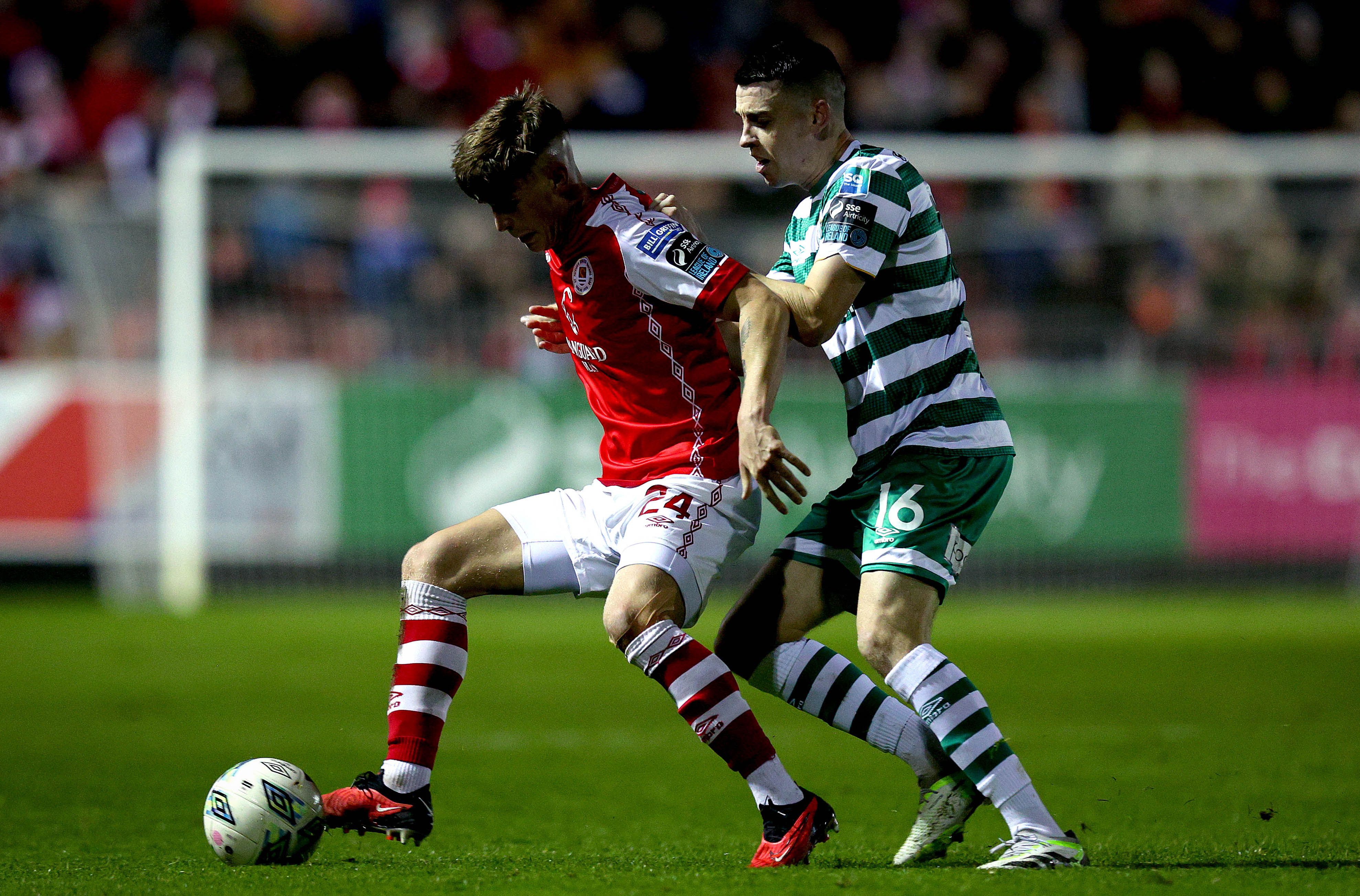 Adam Murphy of St. Patrick’s Athletic in action with Gary O’Neill of Shamrock Rovers during an October league game. Rovers won the league again this year, while Pats prevailed in the FAI Cup. [Inpho/Ryan Byrne]