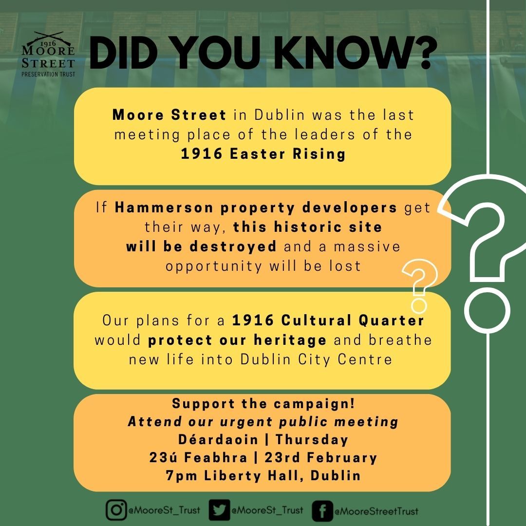 There are no circumstances, no situation, no justification, for allowing the demolition of any part of this historic quarter. So, on February 23, if you can, get to Liberty Hall for the next stage in the campaign to develop a 1916-Moore Street Quarter. Or log on to https://www.facebook.com/MooreStreetTrust/