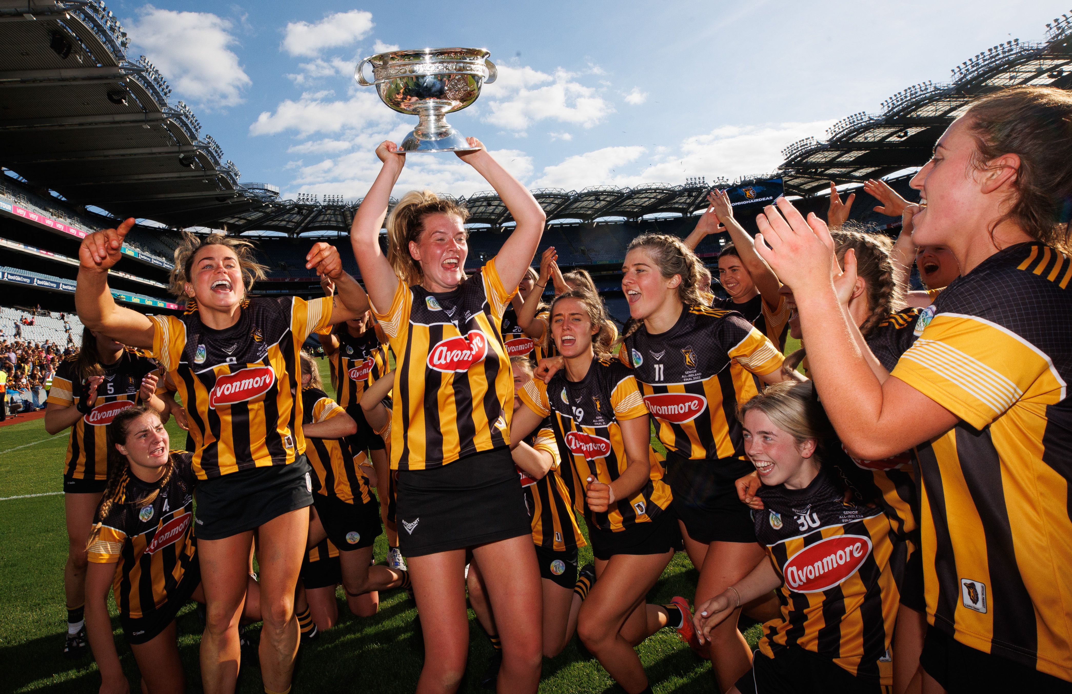 Aoife Prendergast celebrates Kilkenny’s All Ireland title win at Croke Park on Aug. 7, 2022. A London club is recommending a camogie dress-code change. [Inpho/James Crombie]