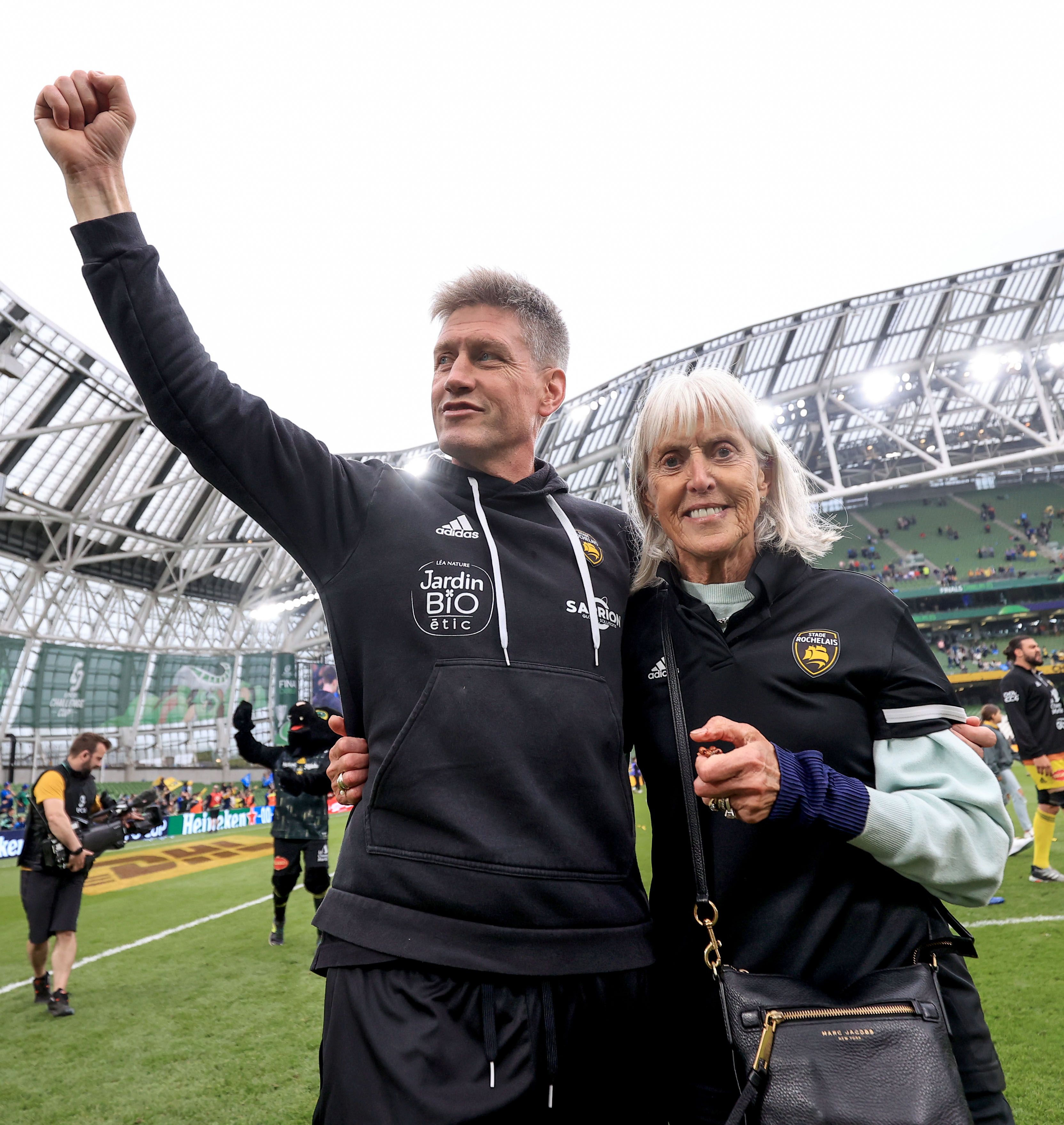 La Rochelle Head Coach Ronan O’Gara celebrates the victory with his mother Joan. [Inpho/Dan Sheridan]
