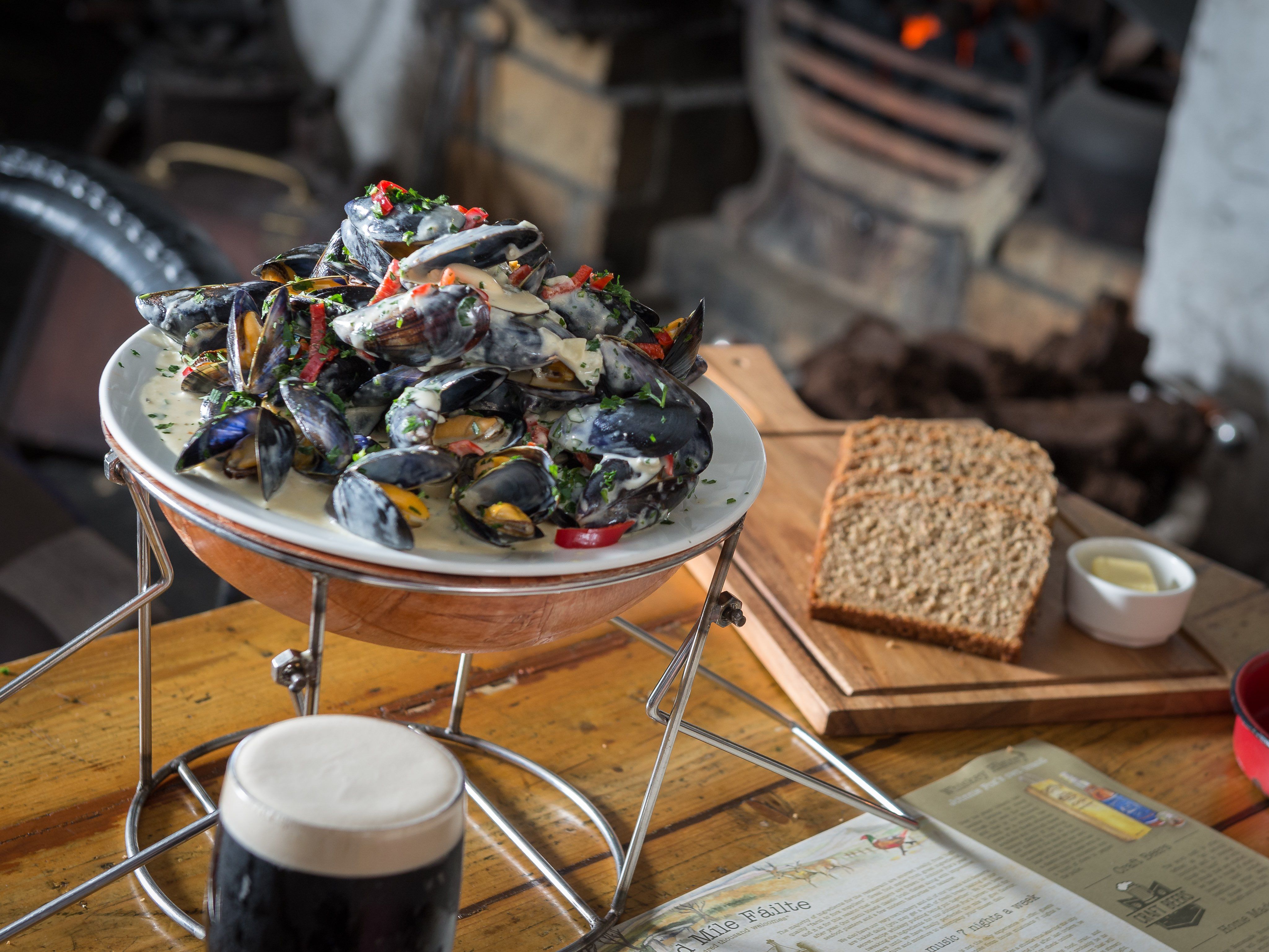 While not technically in County Wicklow, Johnnie Fox’s Pub in Glencullen, County Dublin, is only a 10-minute drive from Enniskerry and thought to be a “must visit.” It’s one of Ireland’s oldest (1798) traditional pubs and renowned for being “the highest pub in the country.” This dish of cider-steamed wild mussels is one of its most popular dishes.
