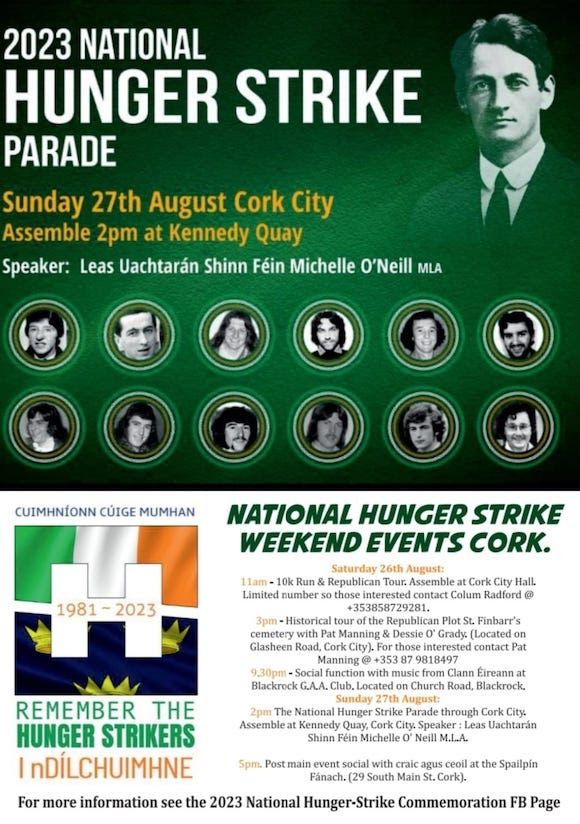 Those participating in the National Hunger Strike Commemoration will assemble at 2 p.m. at Kennedy Quay, Cork City. It will proceed through the city centre to the National Monument at Grand Parade. Bígí linn.