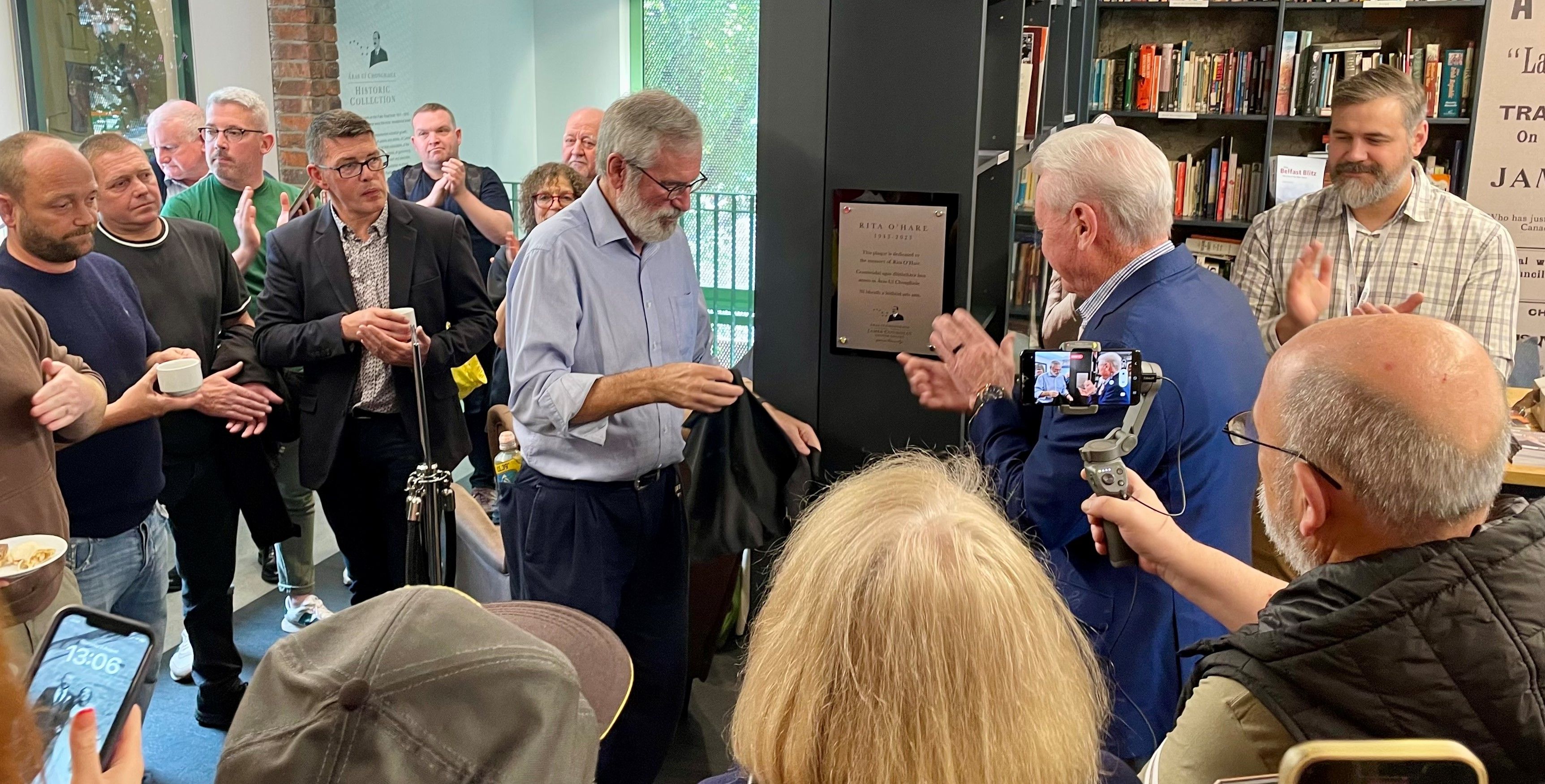 Last Thursday, a large number of family, friends and comrades of Rita O’Hare came together to unveil a plaque in Áras Uí Chonghaile in her memory. Without her unique contribution this important project might never have succeeded.