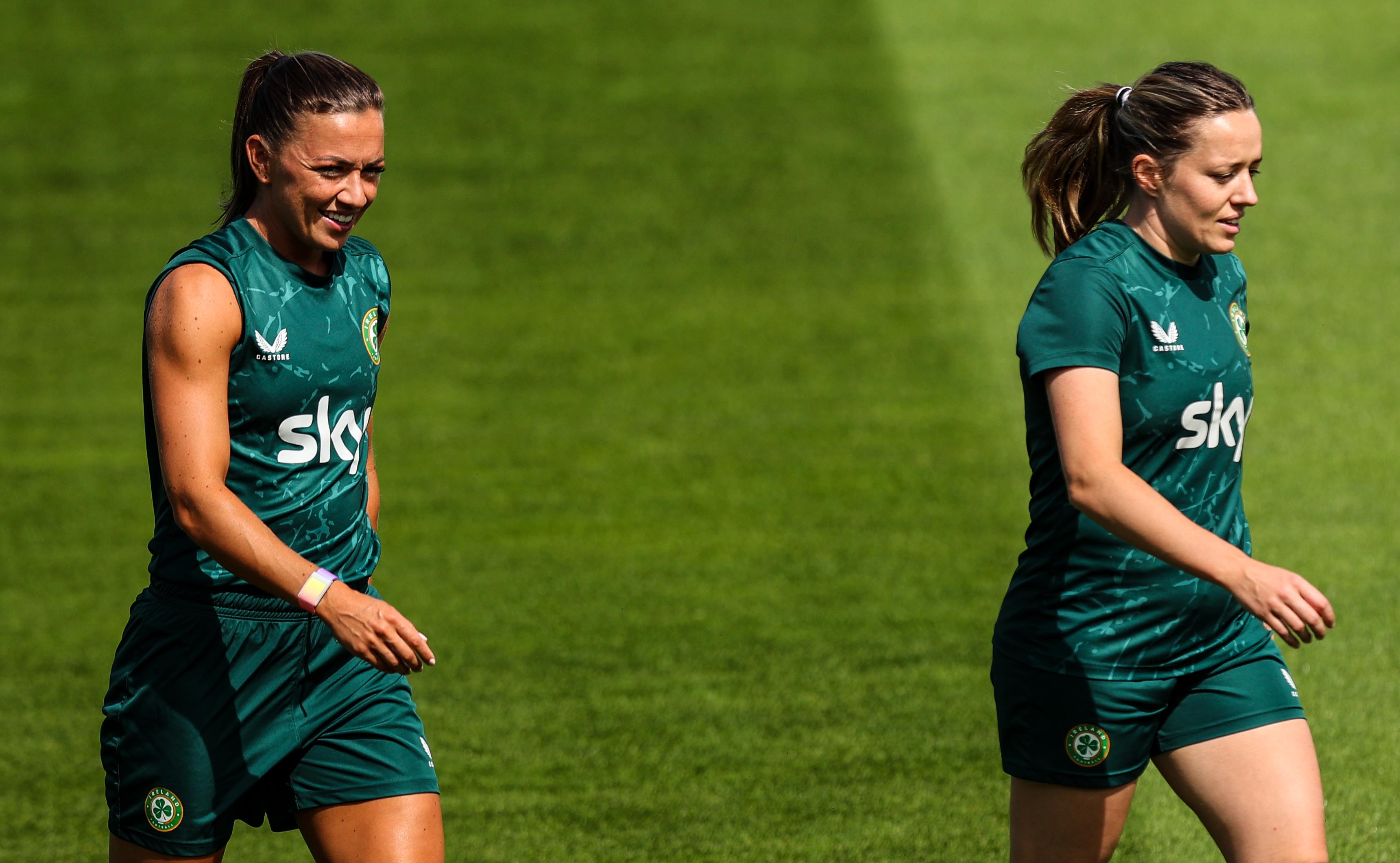 Katie McCabe and Harriet Scott during training at Tallaght Stadium in July ahead of the World Cup. [Inpho/Ryan Byrne]