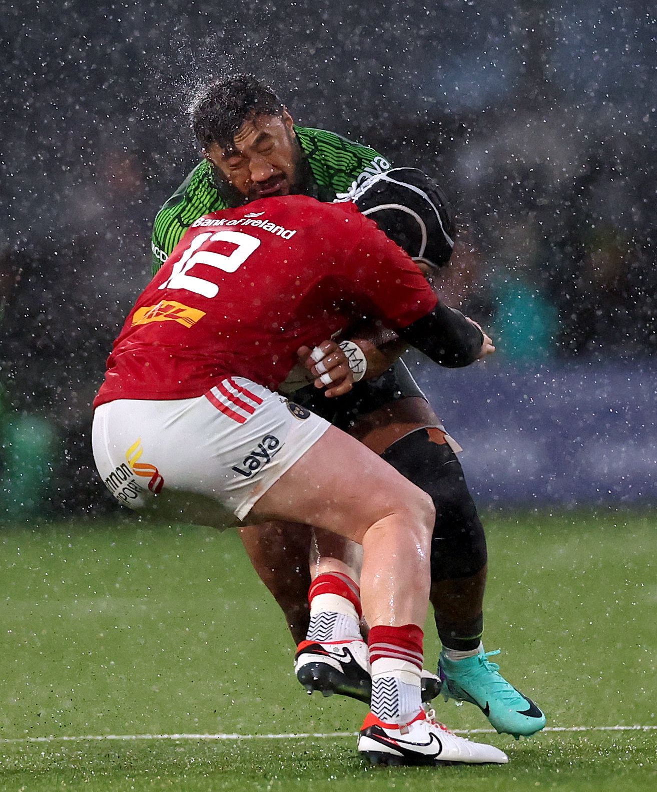Bundee Aki of Connacht is tackled by Munster’s Rory Scannell. [Inpho/James Crombie]