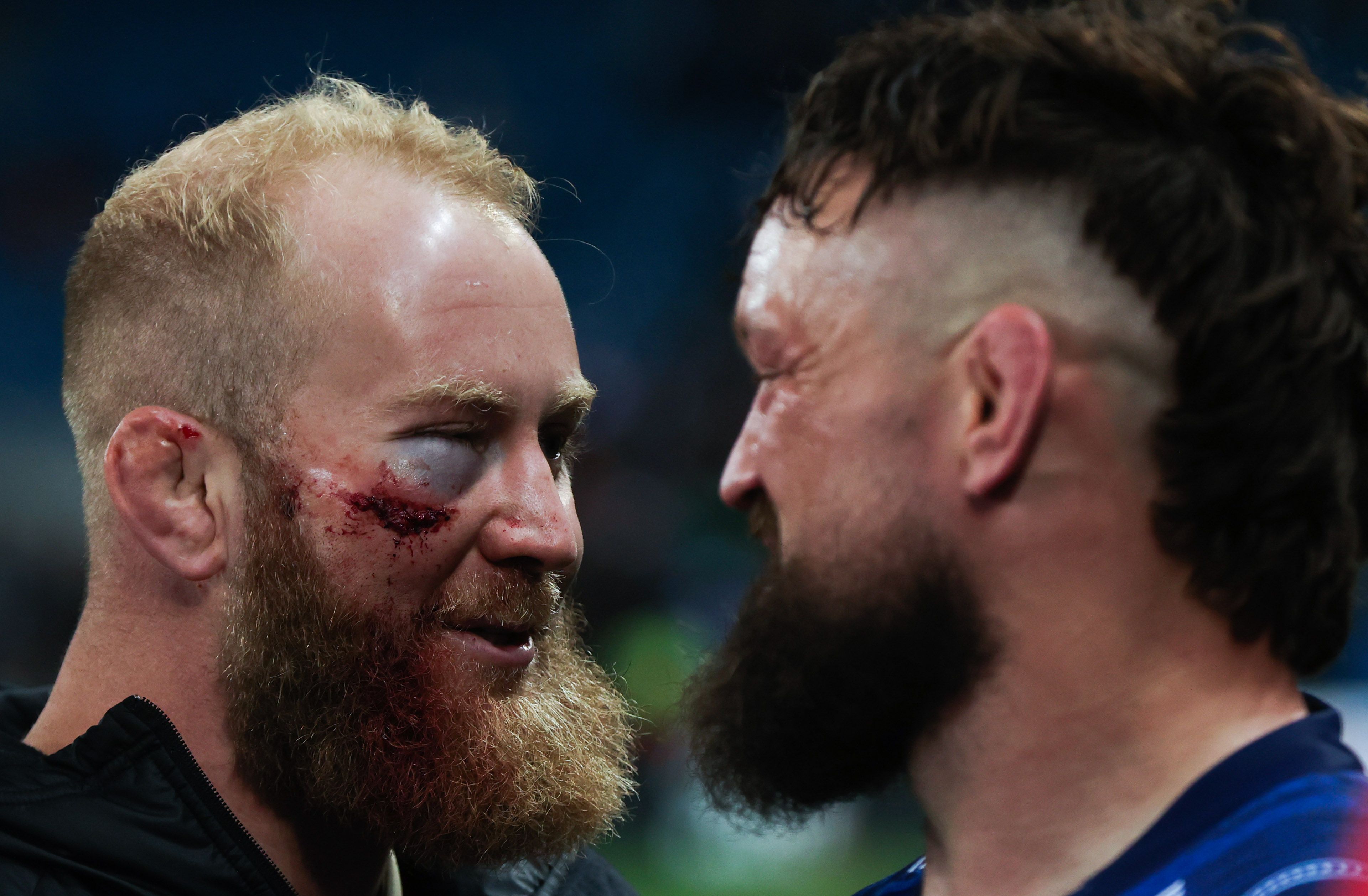 Munster's Jeremy Loughman, left, and Andrew Porter of Leinster after the game. [Inpho/Tom Maher]