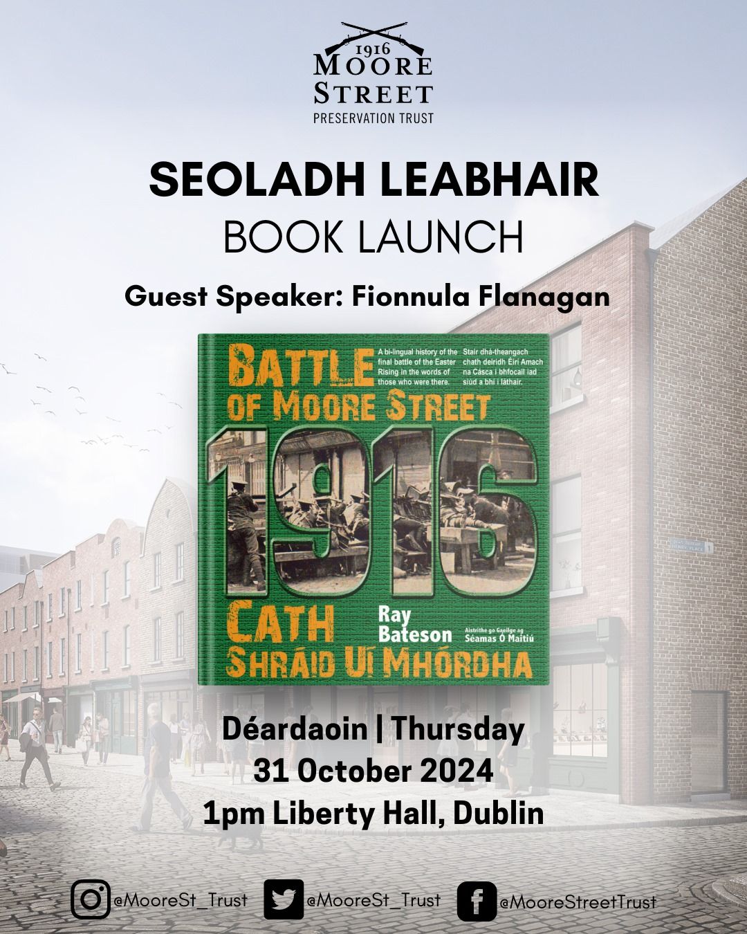 In addition, on Thursday, October 31 the Trust will be publishing Ray Bateson’s excellent book. ‘The Battle of Moore Street – 28-29 April, 1916’, which draws on the recollections and words of those who were there, and retells the story of those two desperate days as the GPO garrison sought to break out of the encirclement imposed by the British Army. Renowned actor Fionnula Flanagan will be the main speaker. The book launch will be in the Connolly Room, Liberty Hall, at 1pm on Thursday, October 31. I look forward to seeing you there.