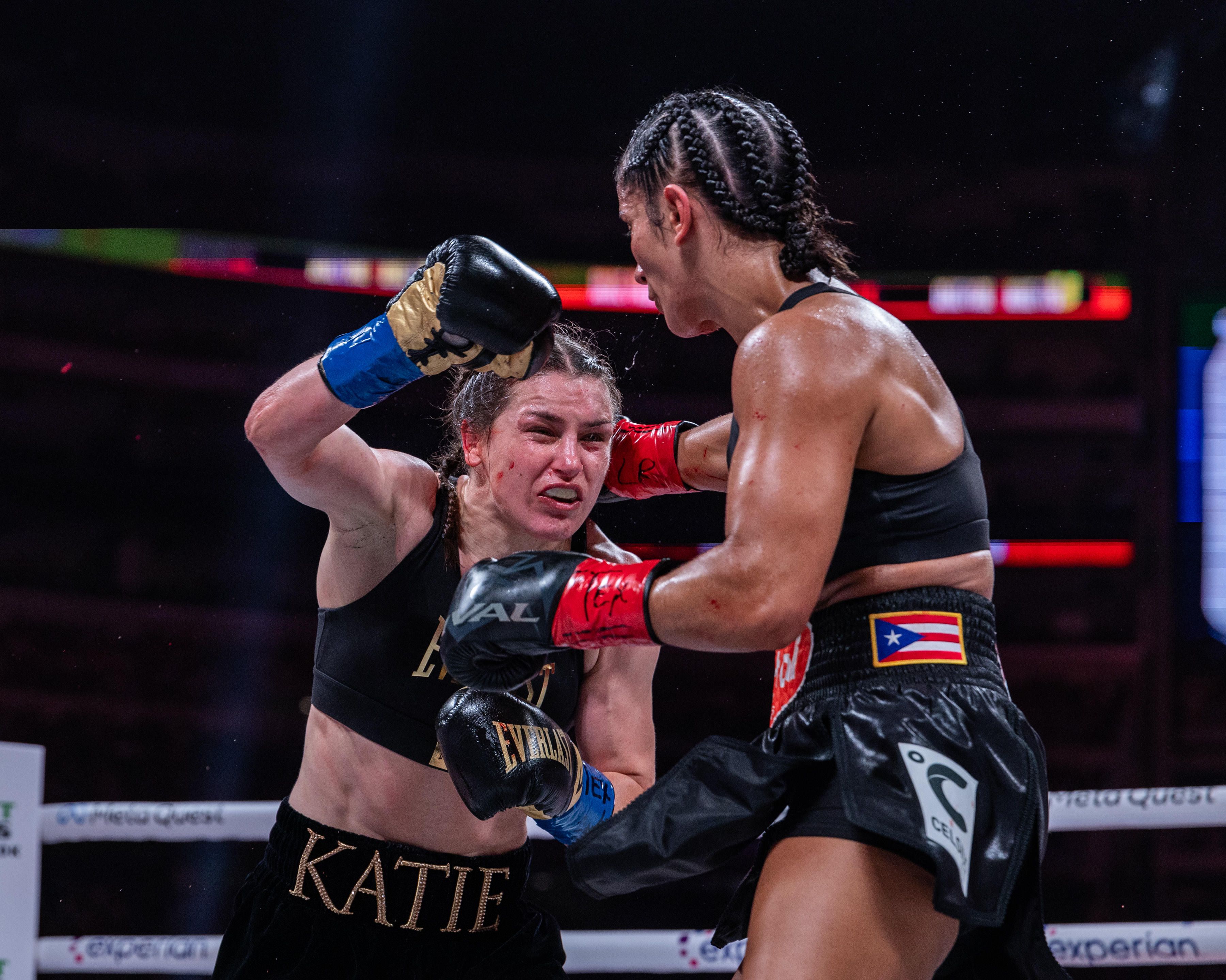 Katie Taylor and Amanda Serrano battle it out at close quarters. [Esther Lin/ Most Valuable Promotions]