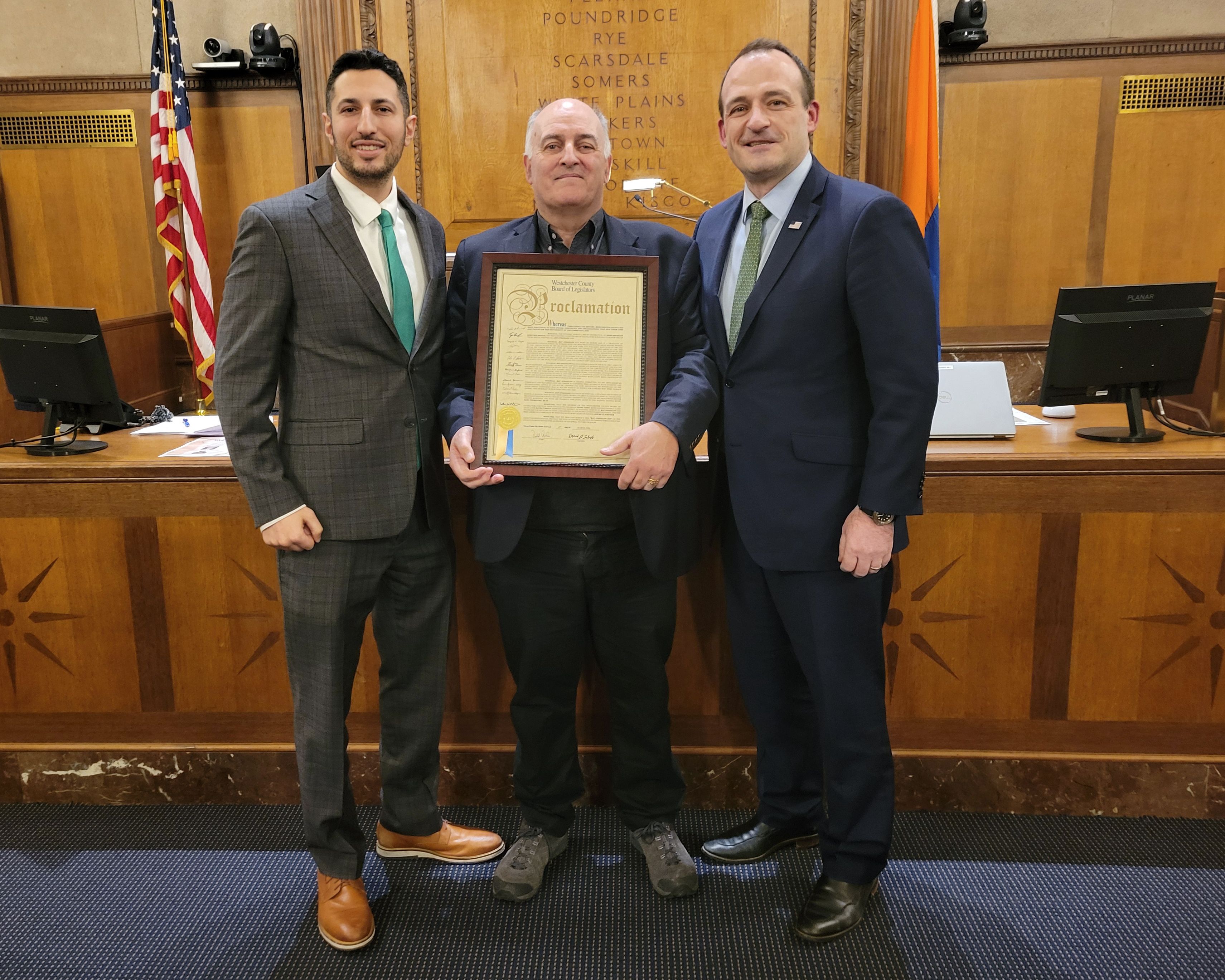 Legislator David Tubiolo (D–Yonkers, Mount Vernon) presented the second proclamation to Ray O’Hanlon, saying “Representing the vibrant community of McLean Avenue with our beloved Irish and Irish Americans is a distinct privilege. Ray O’Hanlon has been the voice for the Irish community for 35 years. He is a source of information of interest to the Irish community here and around the world on historical and educational topics, current events, and so much more. To honor him is to honor someone who epitomizes the Irish-American experience of valuing education, ambition, family values and hard work.”
