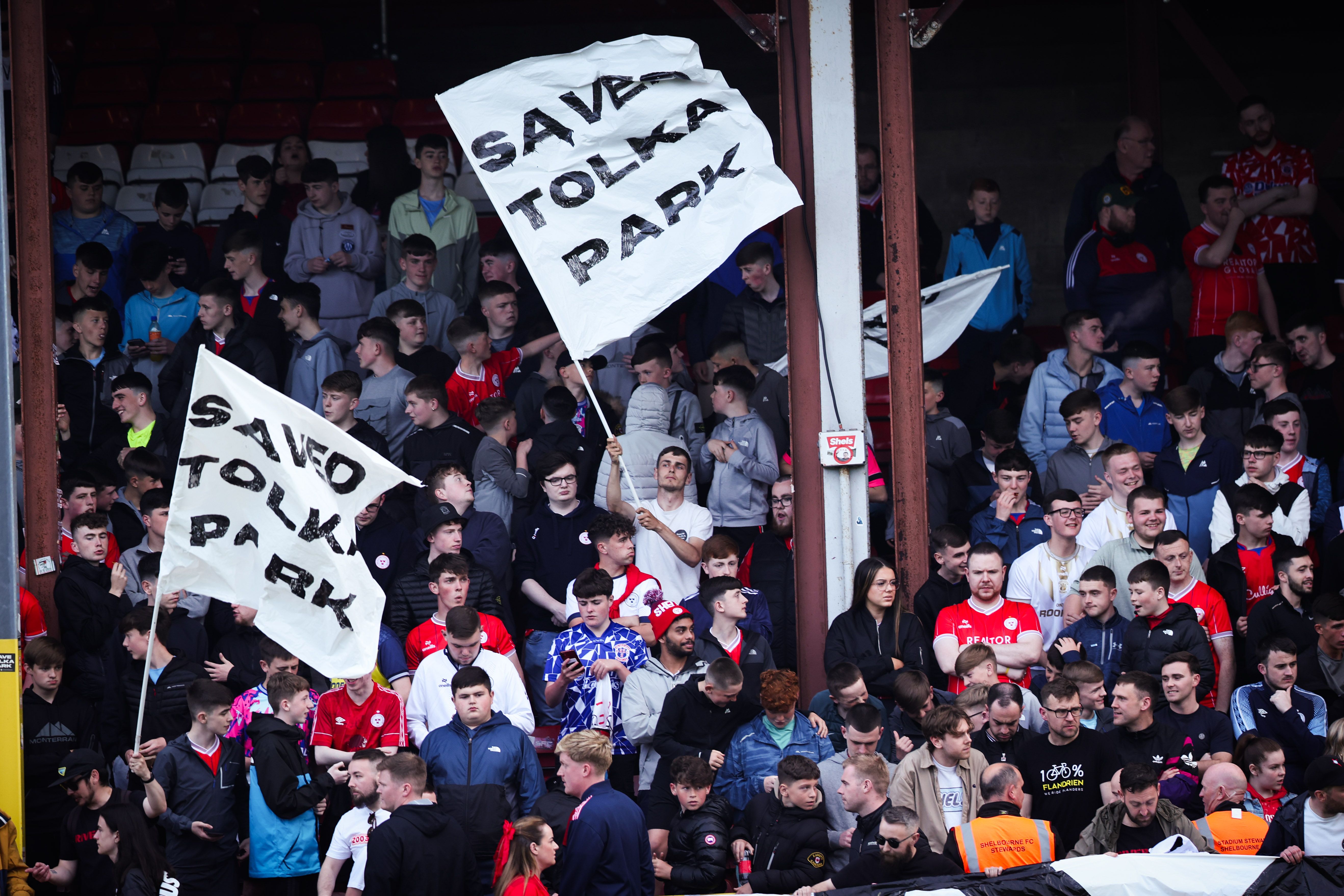 Shelbourne fans wave “Saved Tolka Park” signs ahead of last Friday night’s league game against Waterford. [Inpho/Tom Maher]