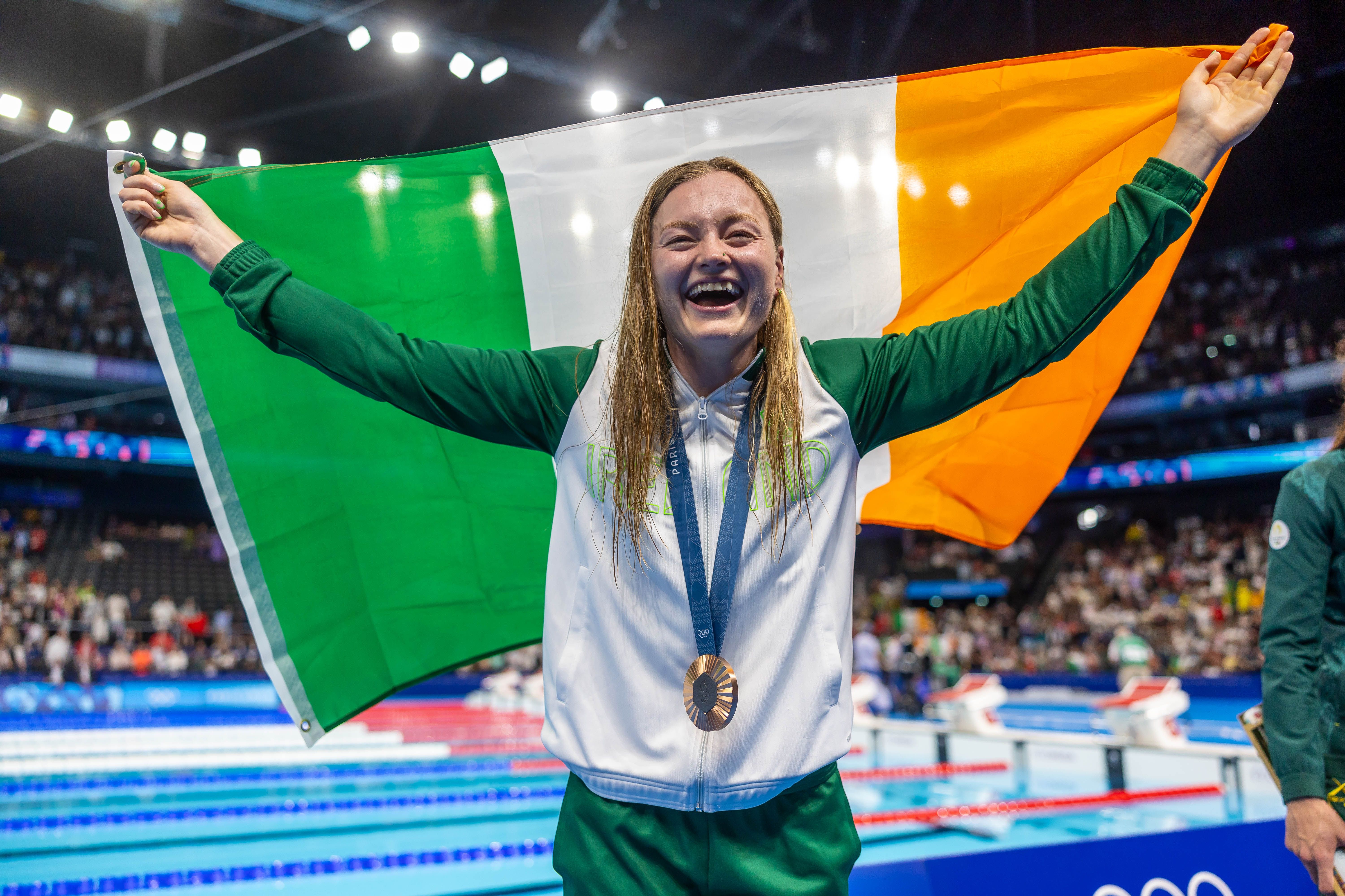 Ireland’s Mona McSharry celebrates with her bronze medal following Tuesday’s Women’s 100m Breaststroke Final at the Paris Olympics. [Inpho/Morgan Treacy]