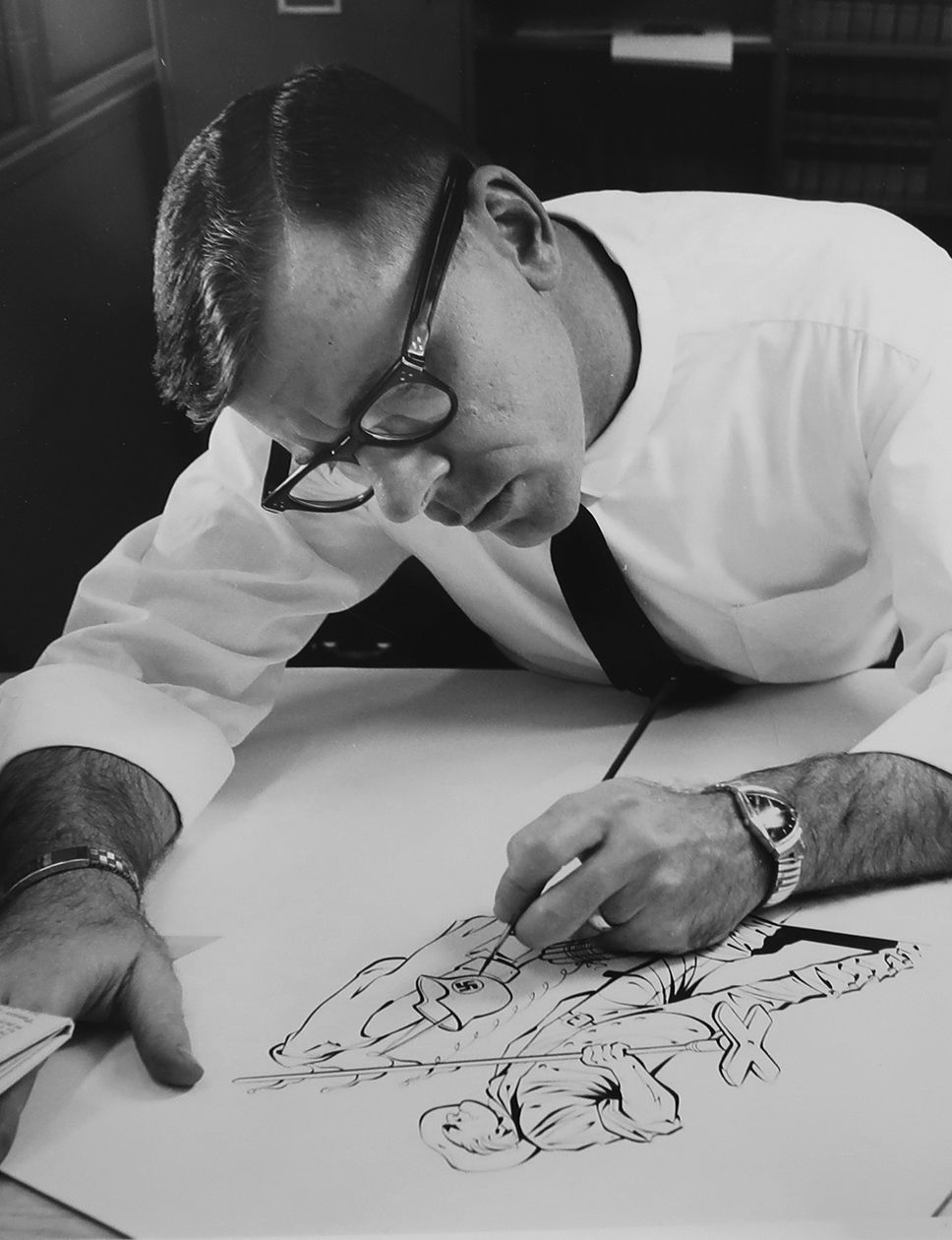 Tom Darcy studied at the Cartoonists and Illustrators School, the forerunner the School of Visual Arts, and joined Newsday’s advertising department in 1956 before switching to editorial cartooning a year later. He went to the Phoenix Gazette in1959, but he was considered too liberal for the paper and moved on to others. President Johnson’s former White House Press Secretary Bill Moyers had taken over as publisher at Newsday in 1967 and brought him back to the paper. Darcy retired in 1997.