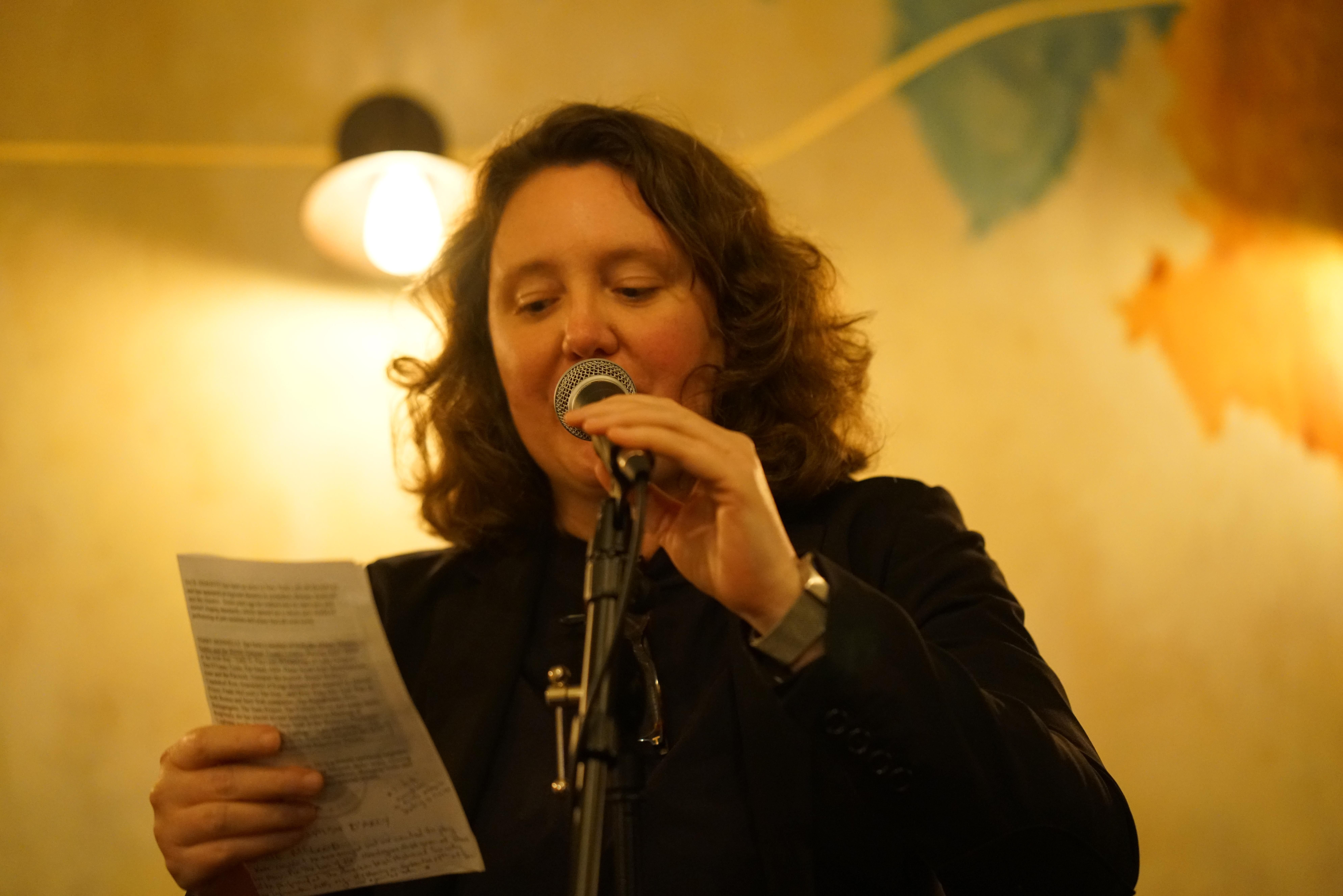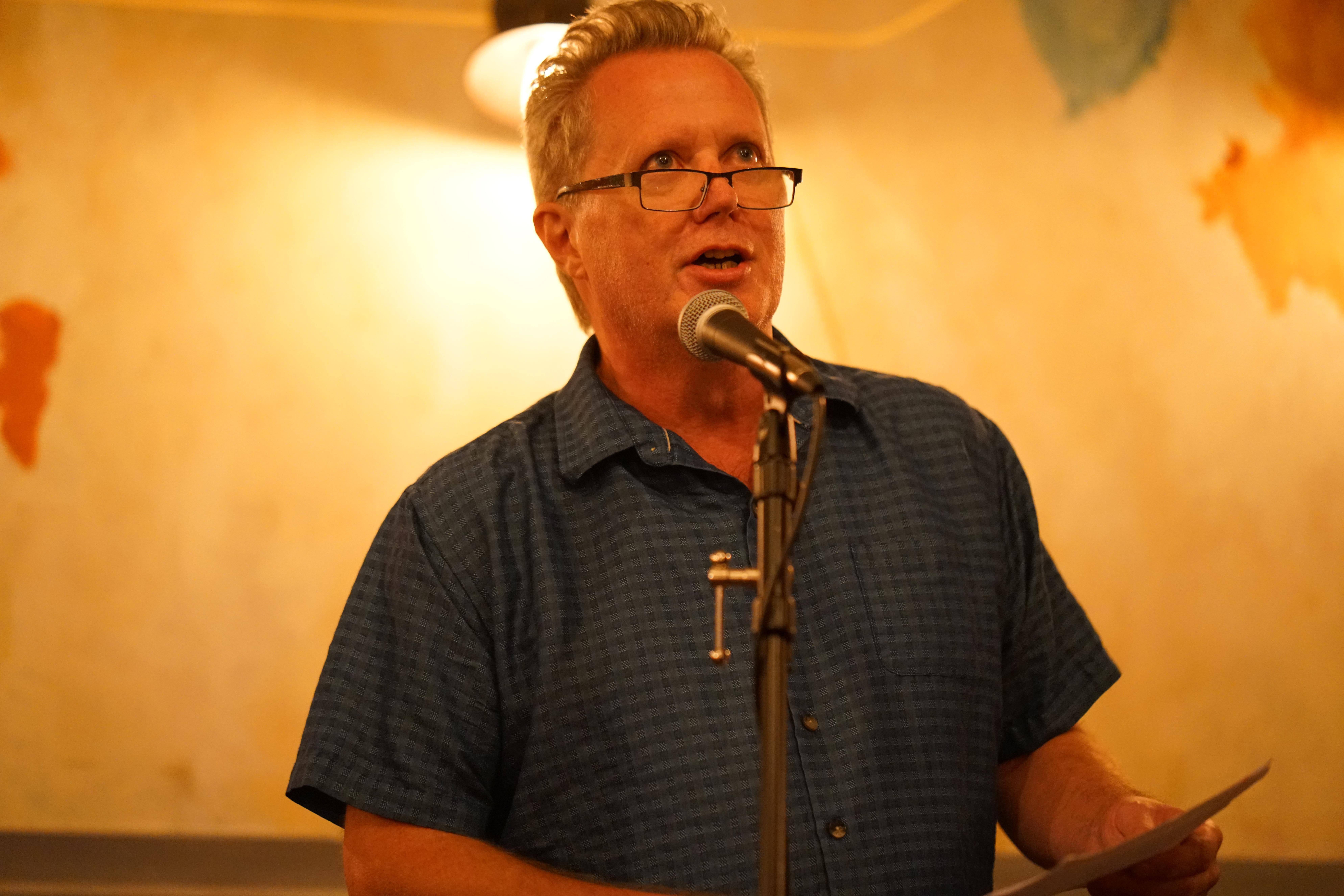 To start things off Katharine introduced Mark William Butler to the audience. Mark is a playwright and composer and a longtime member of the IAW&A. He gave us a quirky original composition from his musical “Ugly Christmas Sweaters.” Just to add a little snow to the spritzers, as he sang “life can be a blizzard…” More from Mark later.