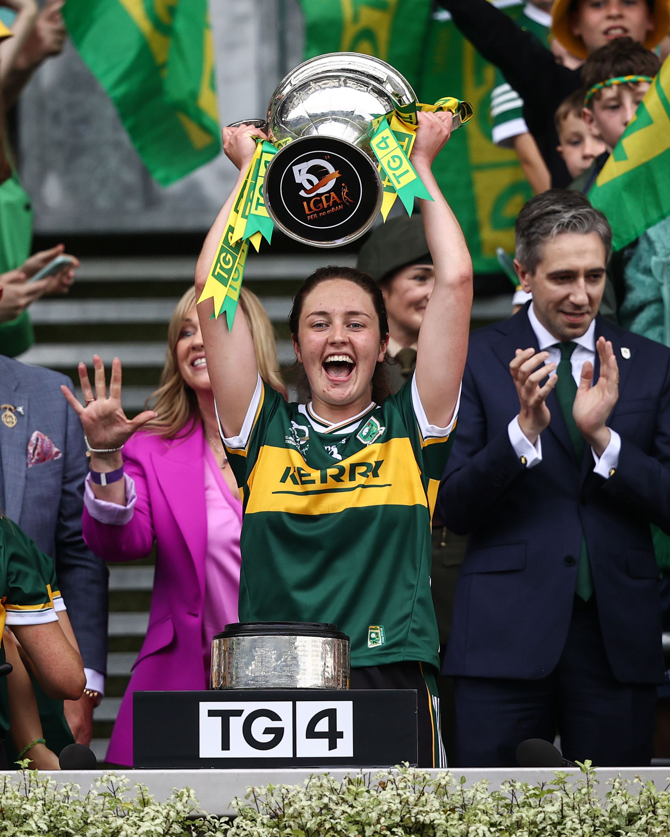 Kerry's Mary O'Connell lifts the Brendan Martin Cup. Inpho/Ben Brady