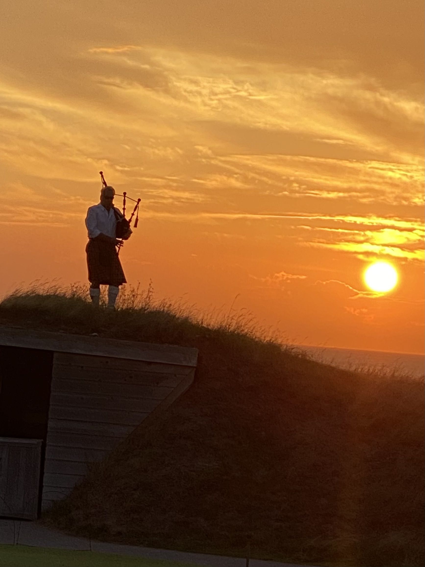Ian McKinnon, acclaimed Nova Scotian highland bagpiper and innovator in modern Celtic music (ianmckinnon.ca), performs at Cabot Cape Breton sunset.