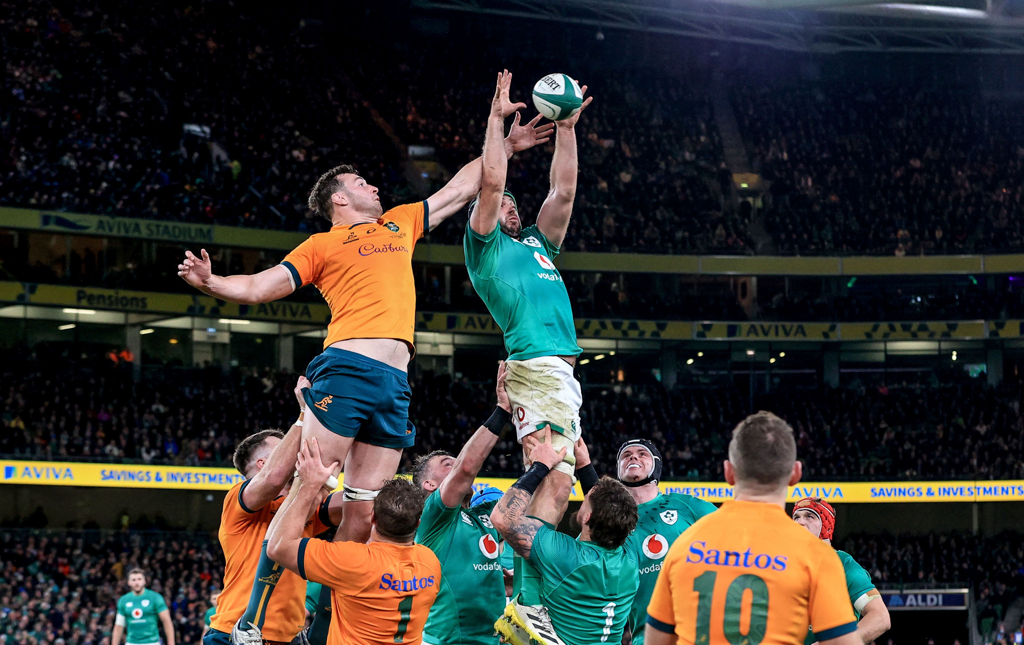 Ireland’s Caelan Doris wins the lineout in the game against Australia during the Autumn Series. [Inpho/Dan Sheridan]