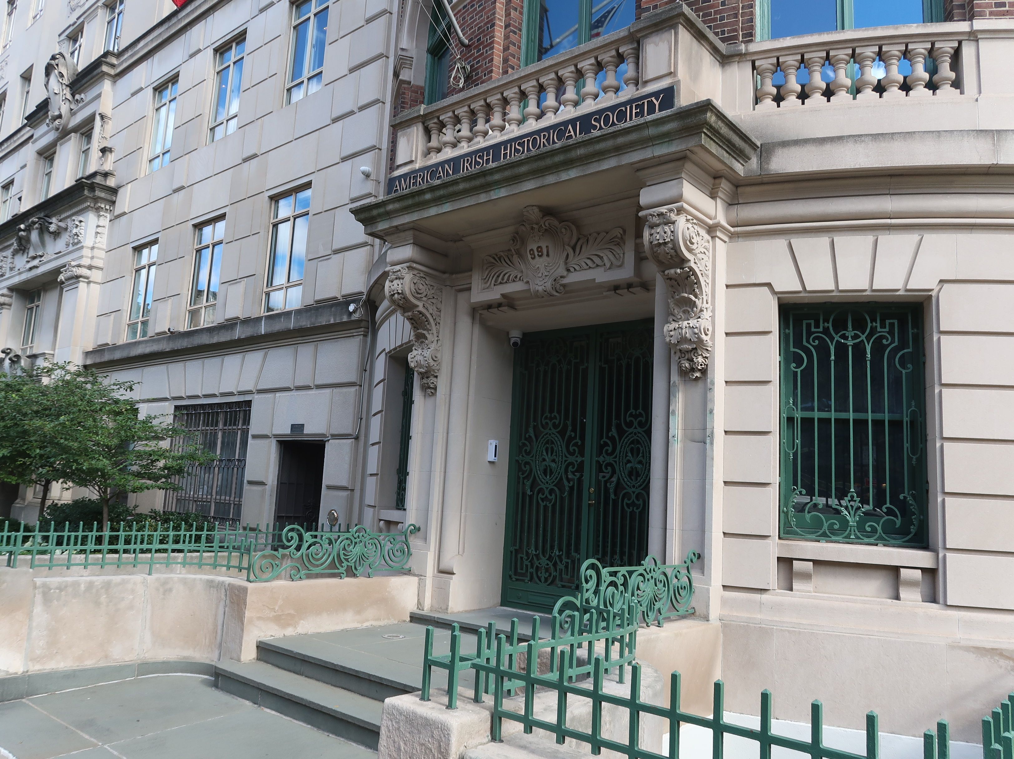 The entrance of the American Irish Historical Society at 991 Fifth Ave., on Manhattan's Upper East Side. [Photo by Peter McDermott]