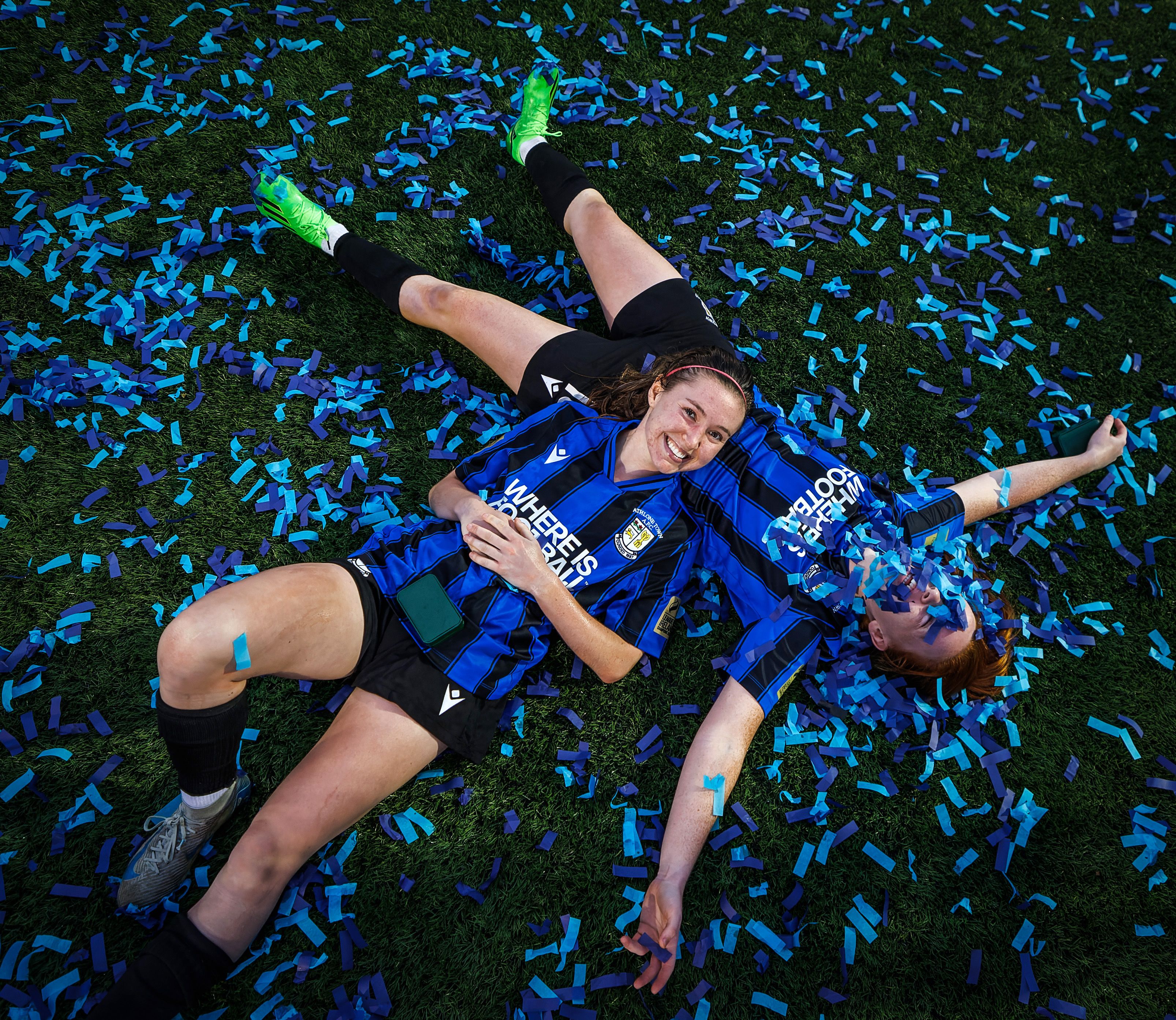 Athlone Town’s Hannah Waesch and Kate Slevin celebrated winning the league title. [Inpho/James Crombie]