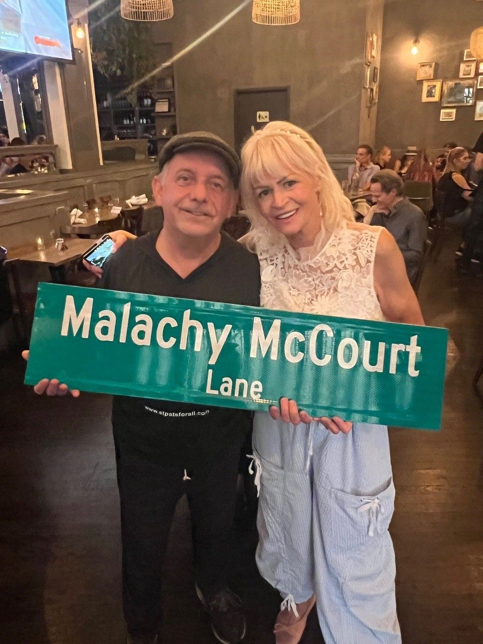 Pic of Day: Pictured is Brendan Fay and Siobhan, daughter of Malachy McCourt, holding the sign that now is in sight of all at West 93rd Street in Manhattan. Photo by Tom Moulton.