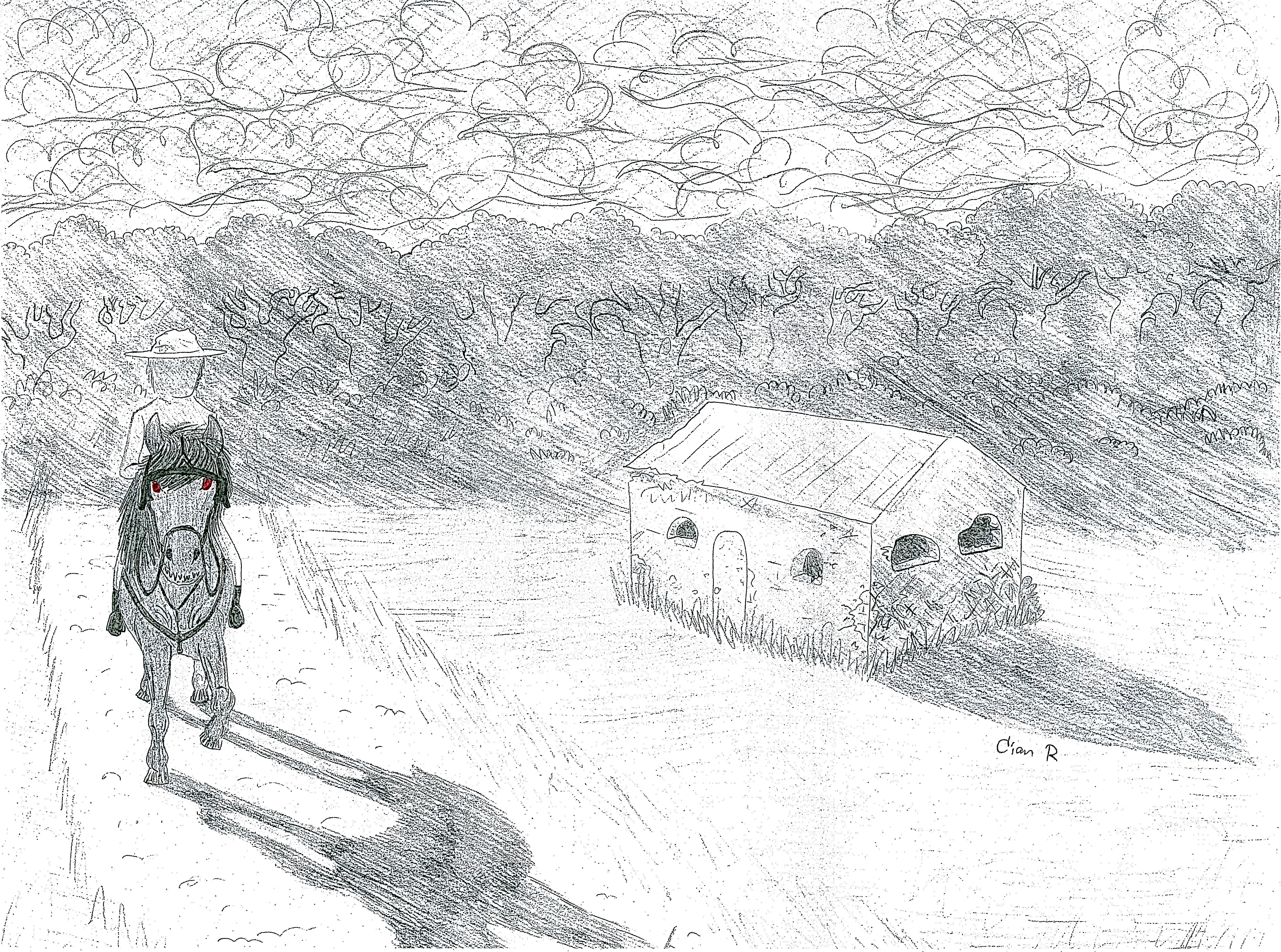 The whispered argument was brought to a halt by a shuffling noise within the house. Johnny and Rick held their breath as something emerged. A hunched and shrouded figure, it slowly shuffled through the door and stood before the horse. The horse looked up. The newcomer spoke. It was an old woman’s voice, harsh and cracked. There was no kindness in it.