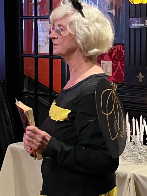 Along with spirits who told their stories, imaginatively costumed silent ghosts joined the party. “Goibniú,” the Celtic god of craft and hospitality, insisted that everyone join in the fun. Following Maura’s bee from Innisfree, we had a butterfly, a spider, a frog and a famous elephant (Babar).