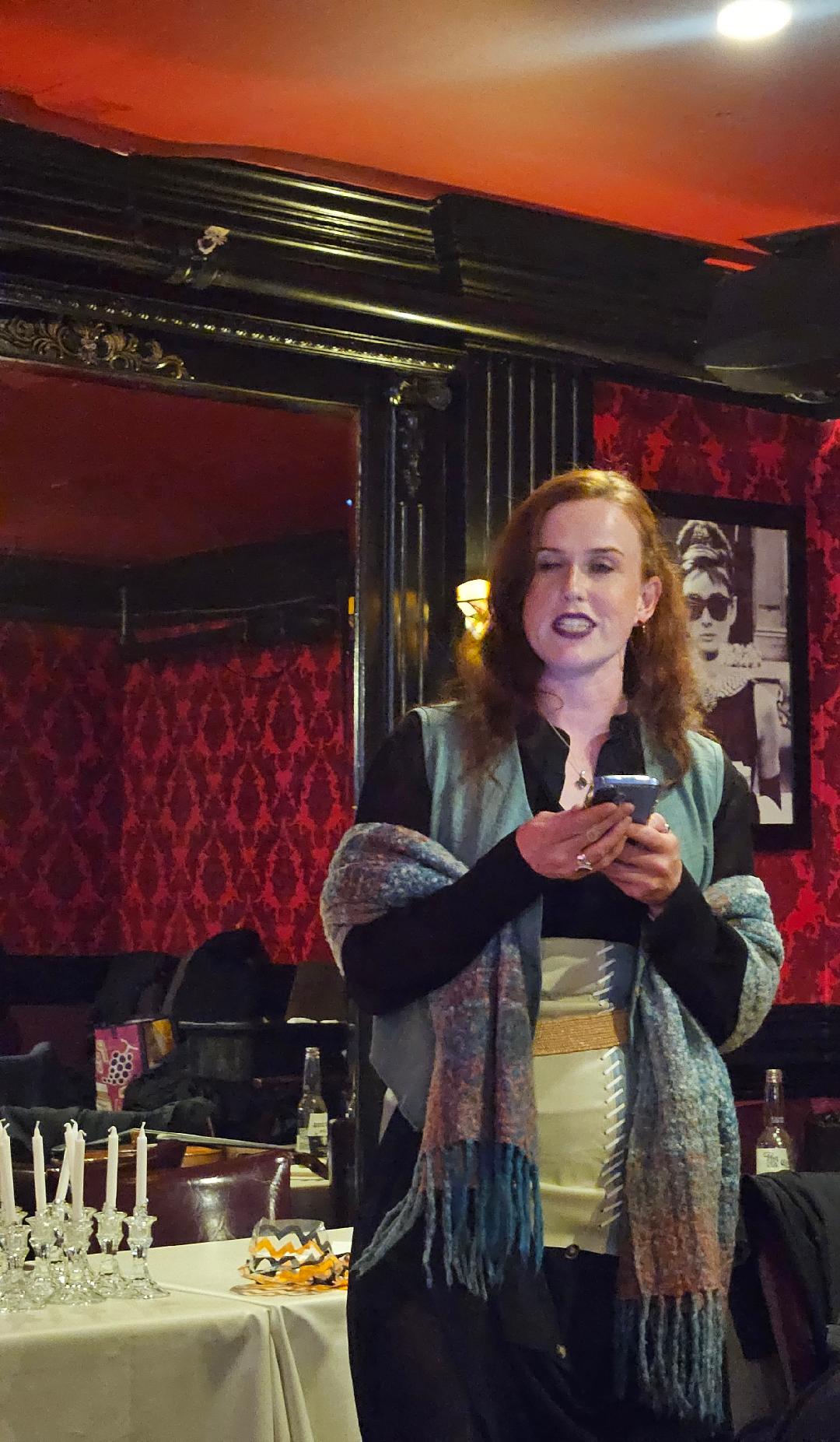 Learning the true story of a pumpkin Jack-o-Lantern was the perfect way to begin the night. Alisoun Price reminded us that Irish immigrants brought the tradition to America, as pumpkins were easier to carve than the traditional turnips. Some say the Jack-o-lantern keeps evil spirits at bay; others see it as a welcome light for returning spirits. So, whether a warning or a guide, the pumpkin is a reminder that stories may travel in the hollow of a humble root.