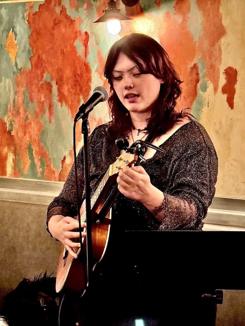 The night’s last presenter was Gigi McCourt, who smiled, “yes, there is a relationship”, before dedicating the songs she would sing to the memory of her grandfather, Malachy. Only Mine and Friend of a Friend were her own original compositions and lyrics. Her third was the Cranberries’ Linger. Her sound was soft, mellow, and moody. The strings followed, and the audience kept time with a foot on the floor. Then all were smiling inside, a large burst of applause for Malachy’s granddaughter.