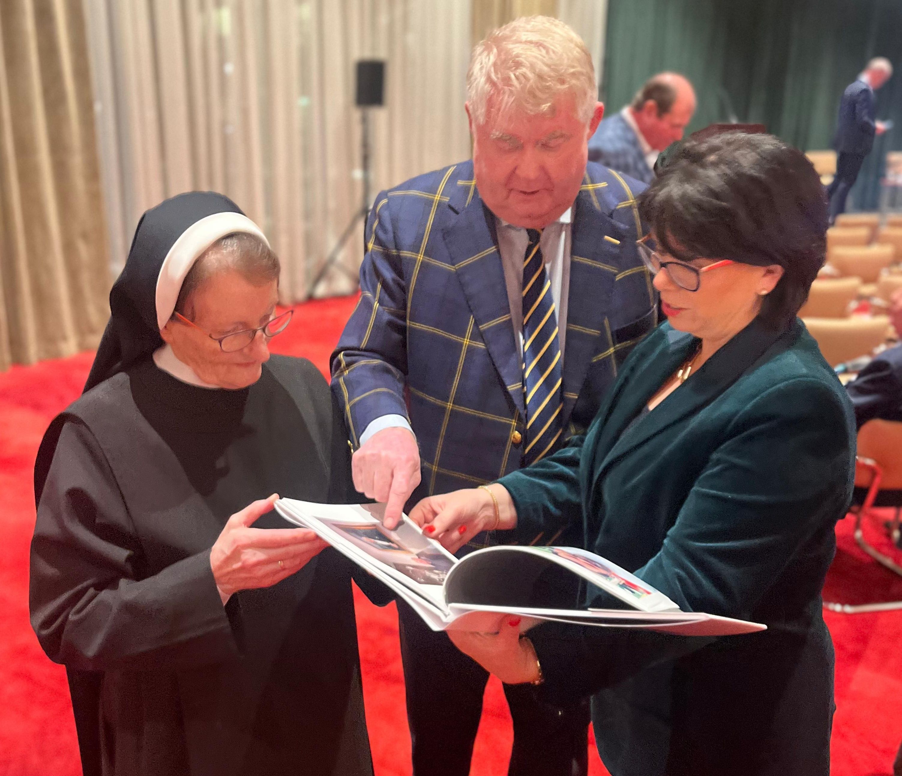 The Kylemore Abbey Team was in New York last week to thank Irish American supporters who made possible the completion of a new Monastery, Education and Retreat Centre for the growing community of nuns and visiting pilgrims — hailed as the most important project in the 350-year history of the Benedictines in Ireland. The new facility was voted Ireland's favourite building in 2025. Leafing through a book about the restoration and new build project at a reception in honour of the Abbey's Big Apple donors were Sr Magdalena Fitzgibbon OSB and Liz McConnell from Kylemore with benefactor Dan Cremins, COO of Kalikow. "We are very grateful to Dan, who visited Kylemore earlier this year with his family, for generously hosting the celebratory reception at Club 101 in the stunning Kalikow skyscraper at 101 Park Avenue," said Kylemore Trust Executive Director Liz McConnell. Anyone who wishes to support the ongoing work at Kylemore Abbey in Co. Galway can email Ms McConnell at this link.