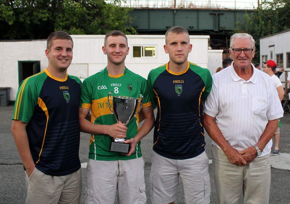 Three grandsons, Conor, Shane and Eddie Hogan and grandfather Richie Hanglow, the last of the founders of St. Barnabas GFC, with the New York senior championship trophy.