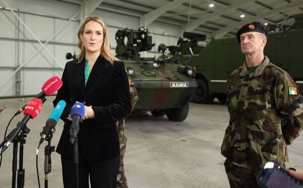 Pic of Day: The Irish government is moving to significantly increase defense spending. Pictured answering questions about these plans is Minister for Foreign Affairs and Defence Helen McEntee. McEntee is pictured Thursday at the Curragh Camp in County Kildare. Standing behind the minister is Brigadier General Brendan McGuinness who commands the Irish Defence Forces Training Centre. Photo by Eamonn Farrell/RollingNrews.ie.
