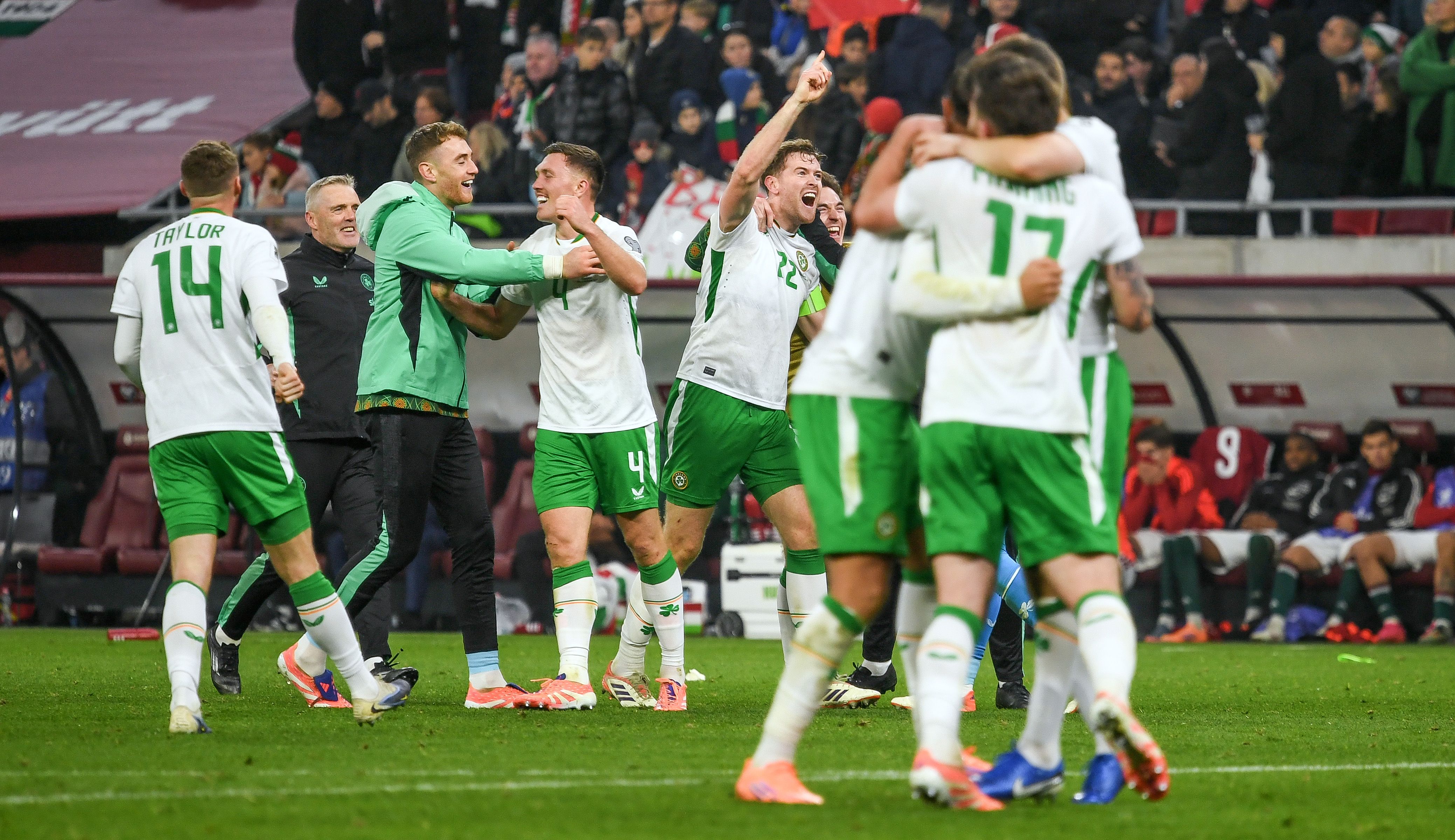 Ireland players and squad members celebrate at the final whistle in the Puskás Aréna, Budapest, on Nov. 16. [Inpho/Anthony Stanley]