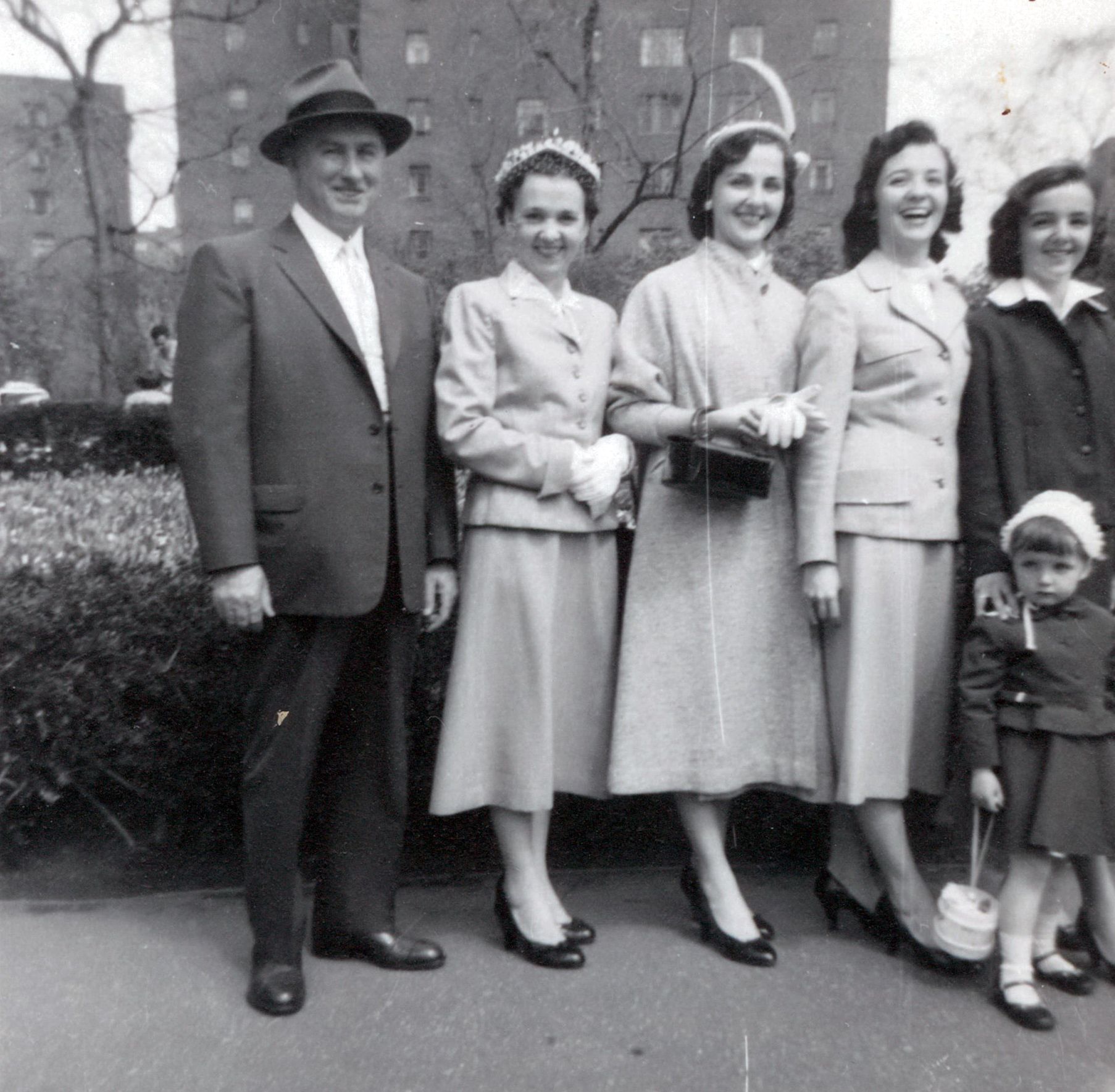 Joanne Dillon pictured with her parents and three older sisters in Parkchester, Bronx, at Eastertime 1956.
