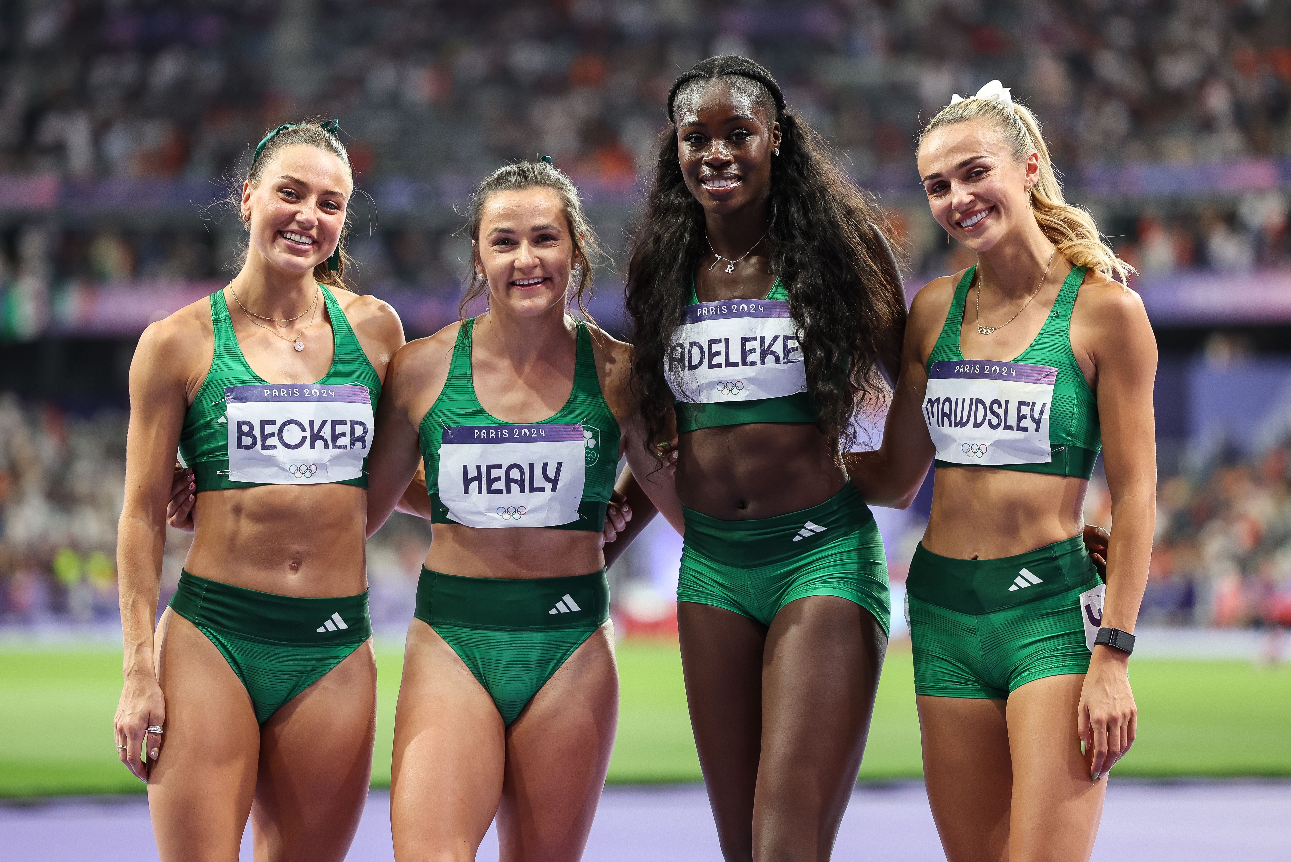 Ireland’s Sophie Becker, Phil Healy, Rhasidat Adeleke and Sharlene Mawdsley after the 4x400 meters final in the Stade de France, at the Paris Olympics in August. [Inpho/Morgan Treacy]