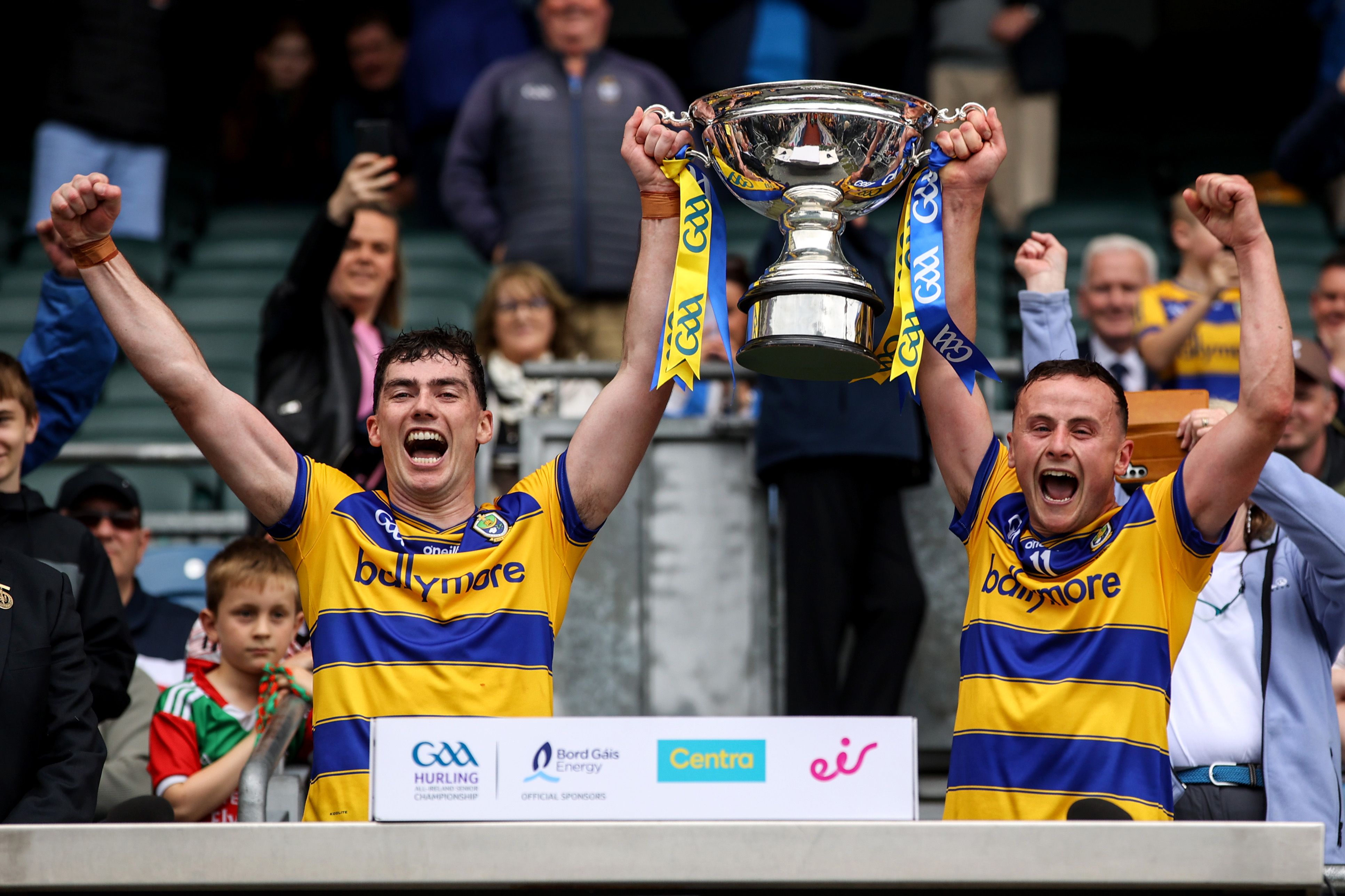 Roscommon hurlers Conor Cosgrove and Conor Mulry lift the Nickey Rackard Cup after the final against Mayo at Croke Park. [Inpho/Ben Brady]
