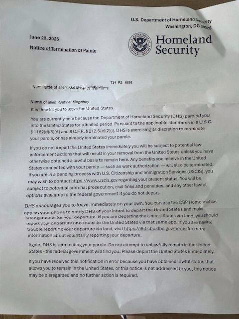 The letter, which is headed "Notice of Termination of Parole," warns Megahey to "not attempt to unlawfully remain in the United States - the federal government will find you. Please depart the United States immediately."