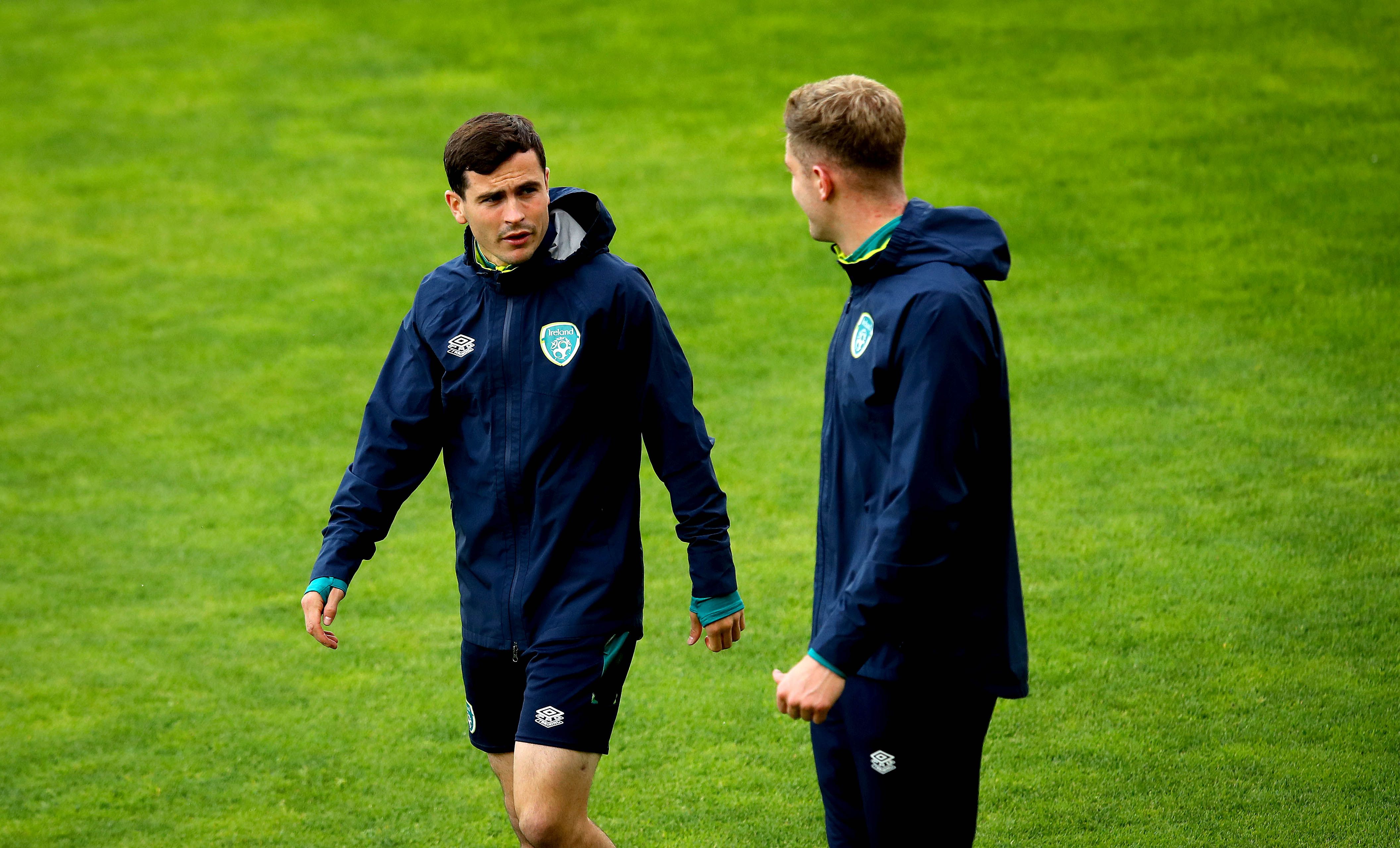 Premier League captains Josh Cullen, left, and Nathan Collins, right, during an Ireland training session in Poland in 2022. [Inpho/Ryan Byrne]