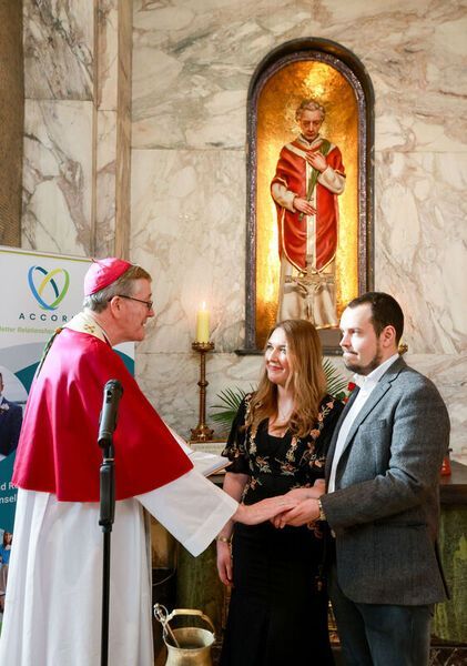 Pic of day: Bishop Denis Nulty blesses engaged couple Lauren Stewart and David Higgins at the Shrine of Saint Valentine in Our Lady of Mount Carmel Church, Whitefriar Street, Dublin, Friday. The ceremony took place beside the reliquary containing the saint’s relics. According to tradition, Saint Valentine was martyred on February 14, 250 AD. In 1836, relics that were exhumed from the catacombs of Saint Hippolytus on the Via Tiburtina, near Rome, were identified with Saint Valentine. These relics were placed in a casket, donated by Pope Gregory XVI, and transported to the Dublin church where they continue to be venerated to this day. Photo Sasko Lazarov/RollingNews.ie.